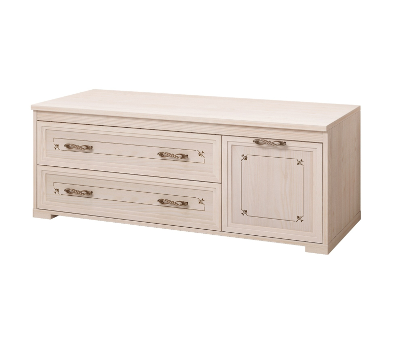 Боковая секция с дверью имеют полки для хранения документов, книг и журналов. Два выдвижных ящика позволят разместить аксессуары. Прямоугольная столешница станет отличным местом под ТВ в гостиной.