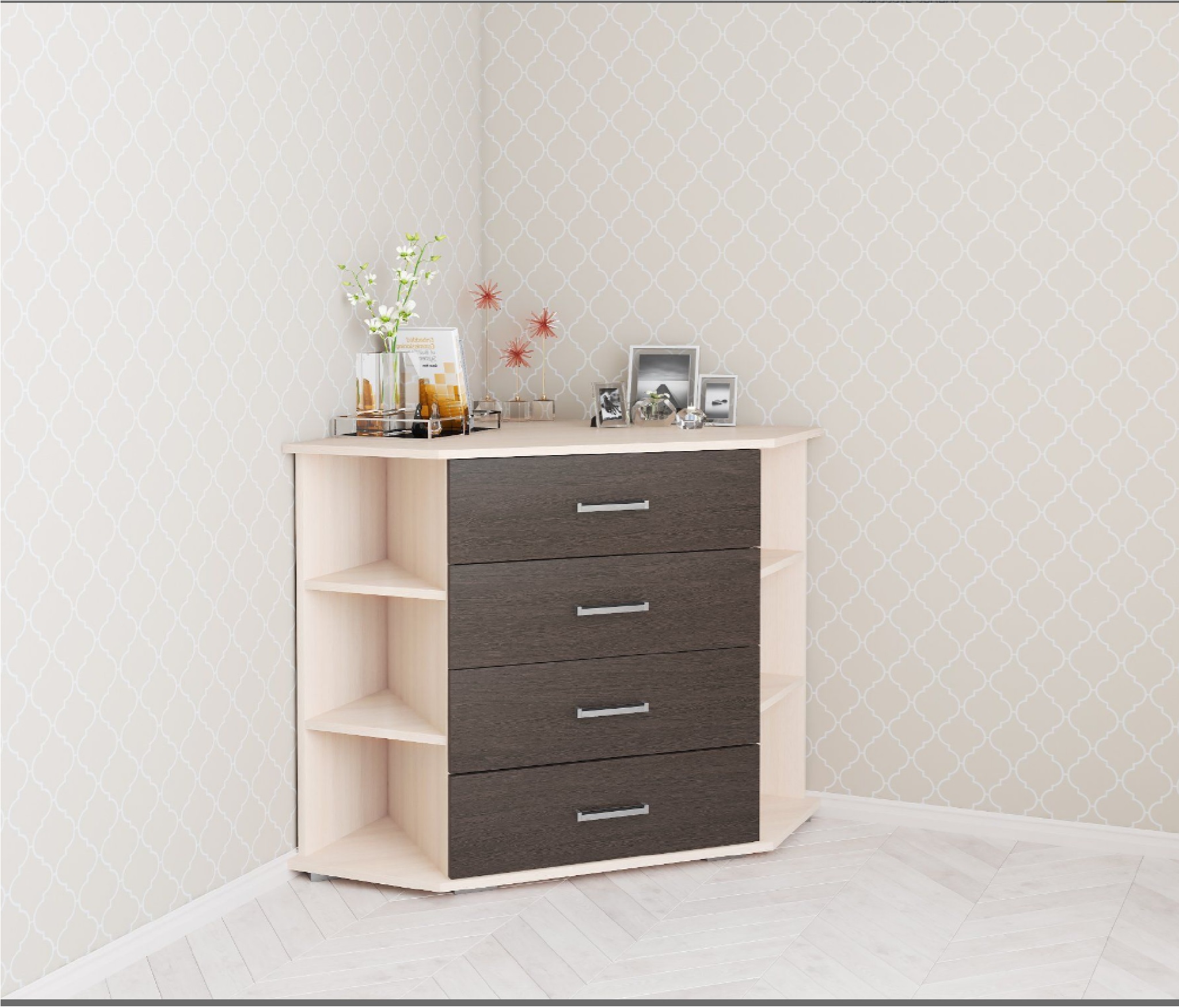 — Угловой комод с открытыми полками и выдвижными ящиками