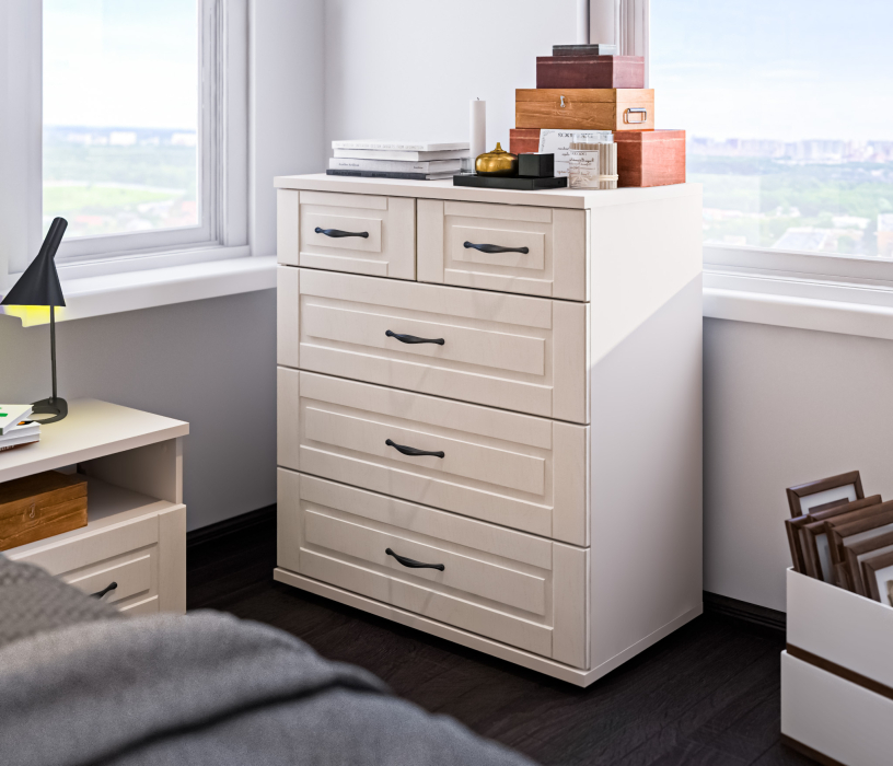 Благодаря светлому цвету фасадных поверхностей и черной матовой фурнитуре, комод Сити смотрится стильно и не громоздко. Фрезерованные фасады из МДФ идеально впишут данную модель как в классический интерьер, так и в интерьер в стиле сканди, Прованс.