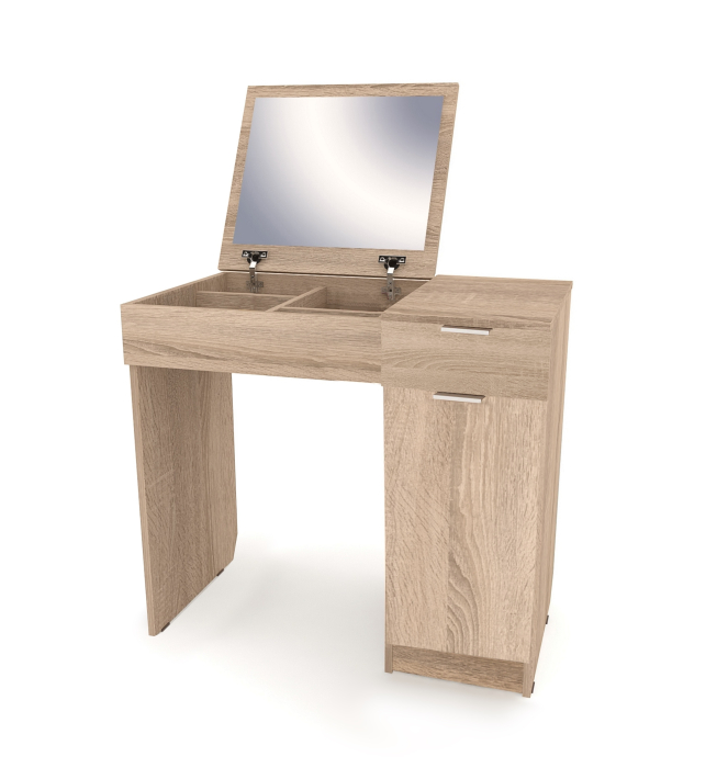 Стол туалетный Римини-3 представляет собой функциональную, но малогабаритную конструкцию, которая не нуждается в большом количестве свободного пространства. Этот столик оснащен откидной столешницей, с обратной стороны которой располагается большое зеркало, к тому же под ней есть несколько ящичков для хранения косметики.