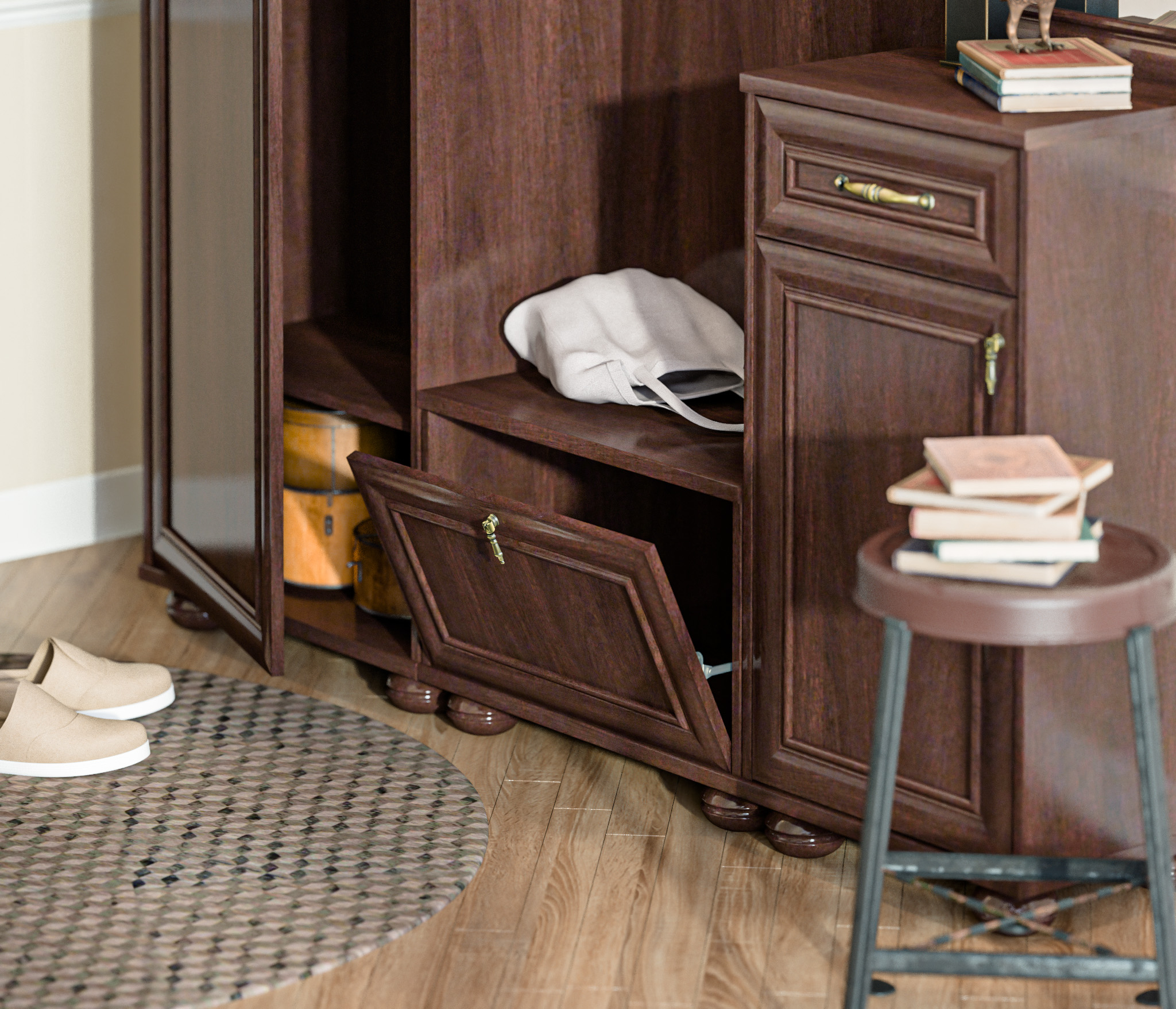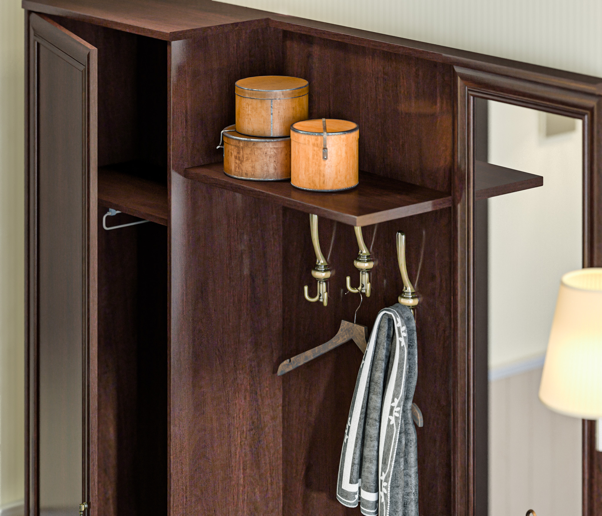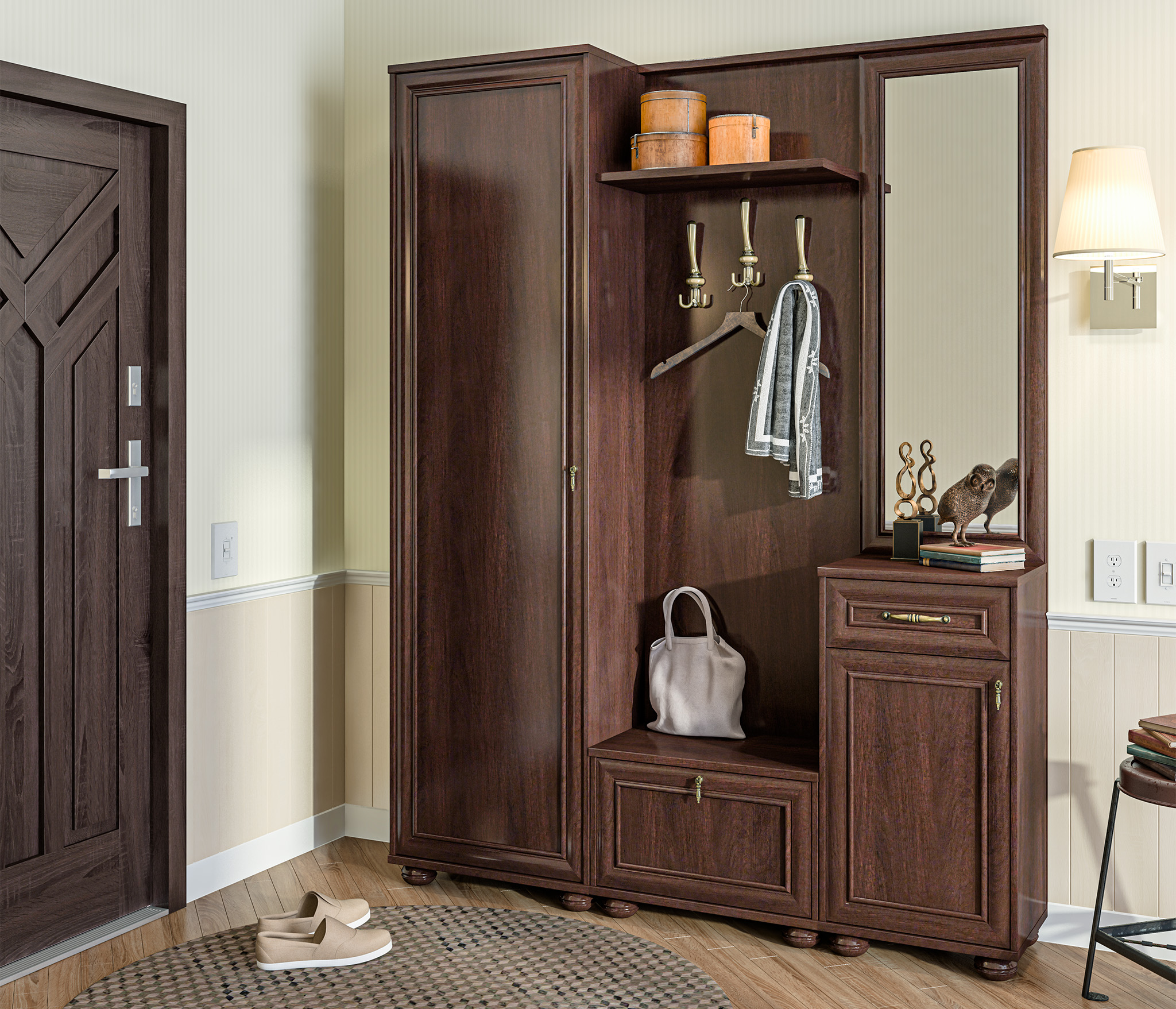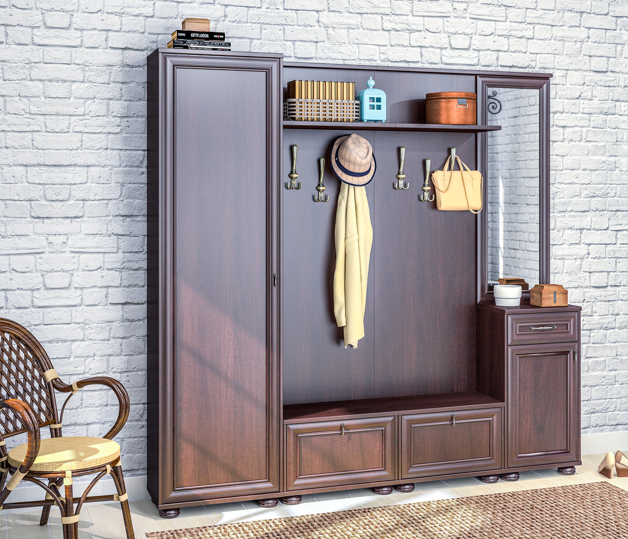 Простенький, но стильный дизайн в классическом варианте. Цена впечатляет на покупку. Цвет ближе к палисандру, чем махагон. Подойдёт для маленькой прихожей в глубину. А по ширине можно всё скомпоновать самому, докупая другие предметы.