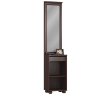 Габаритные размеры – ширина 46 см, высота 219 см и глубина 35 см. Нижняя часть – отделение с отдельной дверцей в котором можно хранить обувь и сумки. А в выдвижном ящике можно хранить разную мелочь. Тумба оснащена протекторами или «лапками», которые не позволяют повредить полы во время перестановки. Тумба выполнена в классическом дизайне из экологичного современного материала. Отделка в цвете «Мара Махагон».