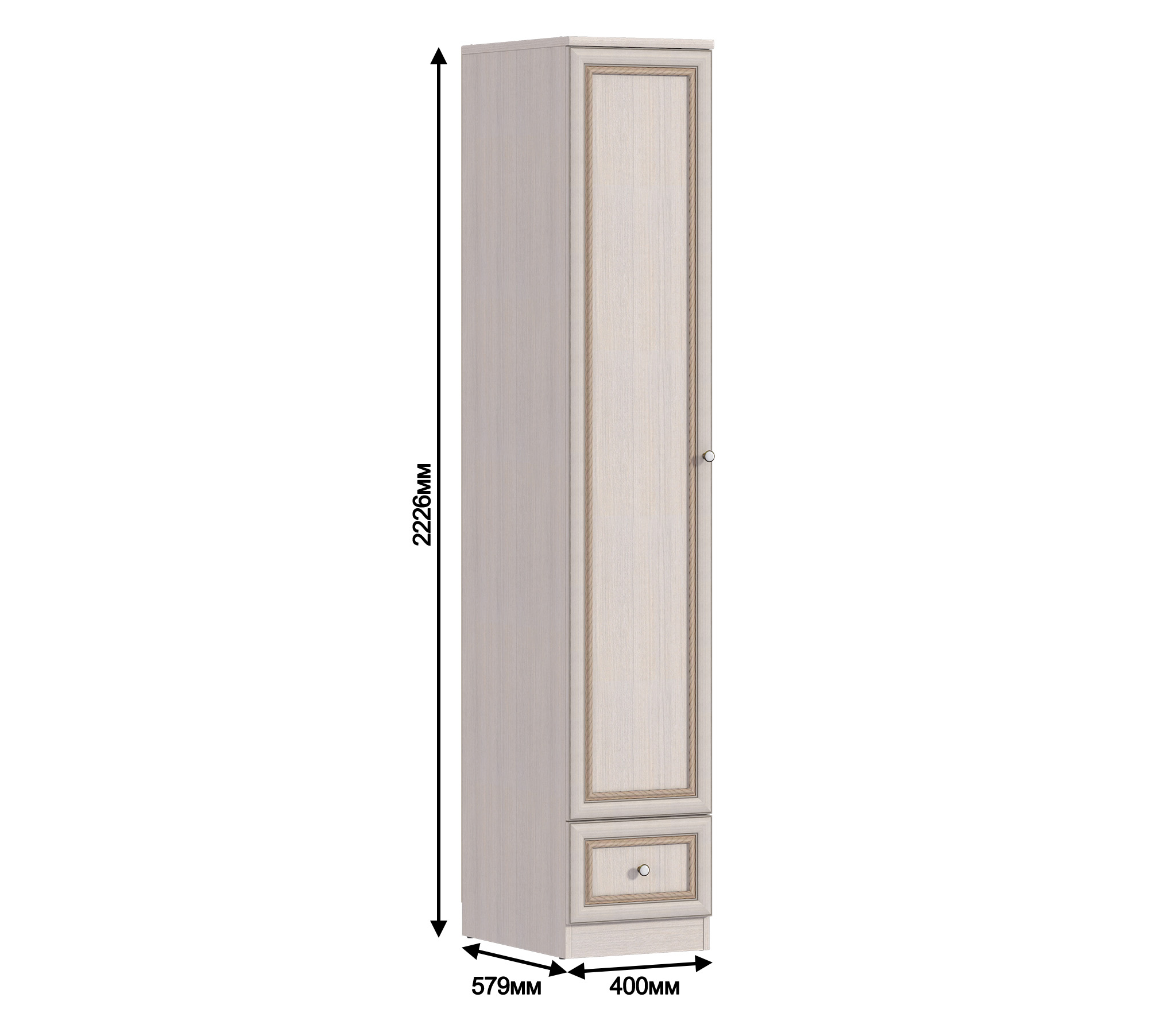 Шкаф довольно компактный с габаритными размерами ширина 40 см, высота 222 см и глубина 57 см. Шкаф оснащен большим отделением со штангой для одежды и верхней полкой, а также выдвижным ящиком.