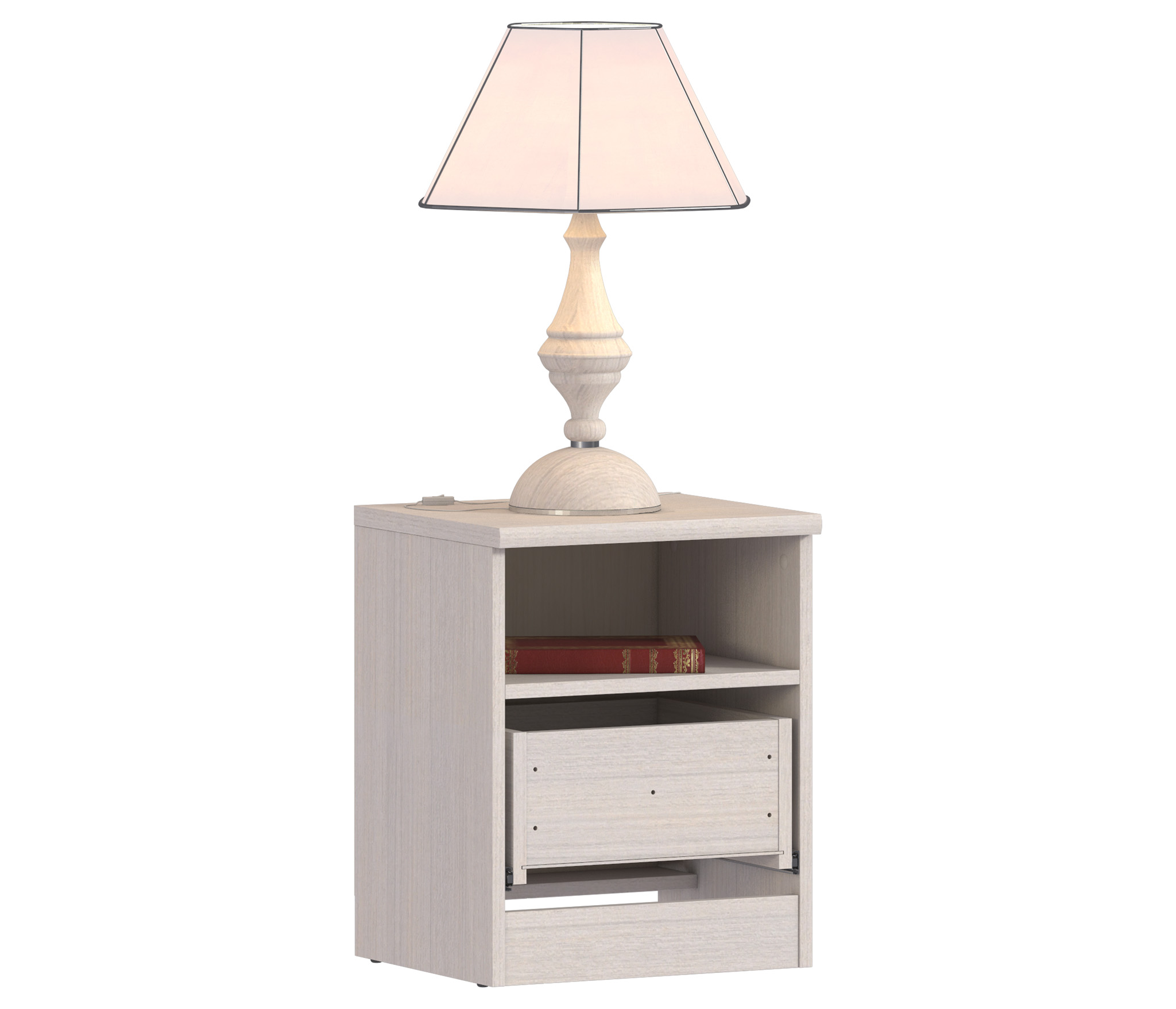 Габаритные размеры тумбы – ширина 40 см, высота 50 см и глубина 35 см. Под столешницей расположены полка и выдвижной ящик. Корпус тумбы выполнен из современного и прочного КДСП, фасад выполнен из МДФ в цвете «Авиньон», с металлической ручкой-кнопкой с фарфоровой вставкой.