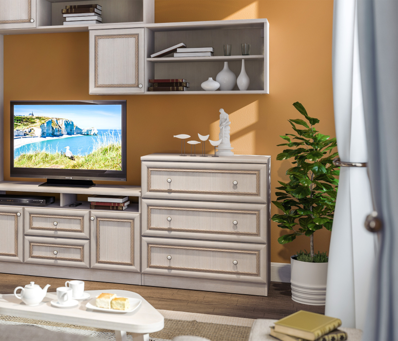 Несколько лет назад купили набор Грация-большая кровать, тумбочка и шкаф-пенал. Сейчас отдали Мебель родителям, хотели докупить стеллаж этой серии-так как очень нам нравится стиль и цвет. Но в наличии не оказалось-решили взять комод.