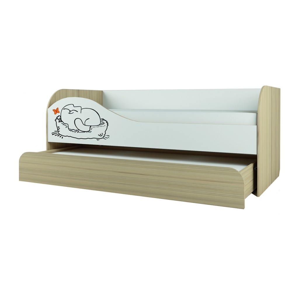 Изображение спящей "Кисы" на изголовье добавляет шарма кровати. Дети и подростки любят мультяшный зверушек, а значит кровать придется им по вкусу.Высота от пола до основания спального места: 400 мм. В основании щит ЛДСП..