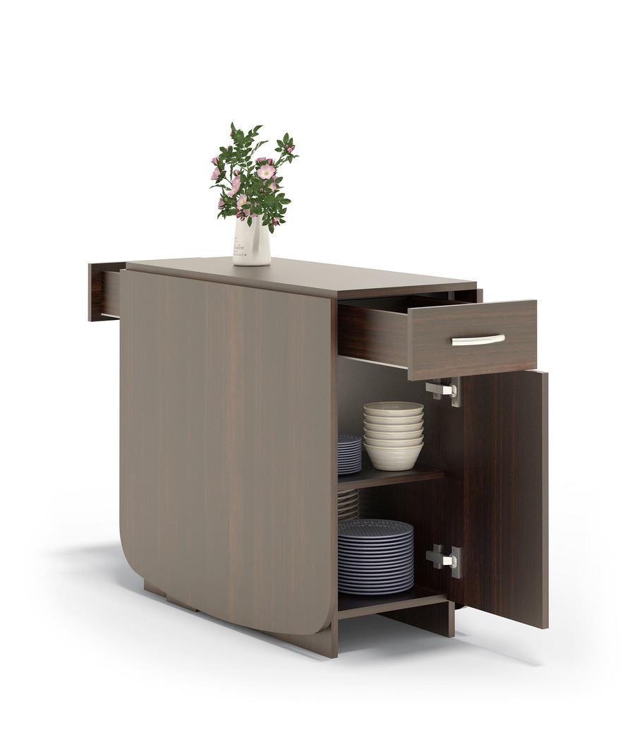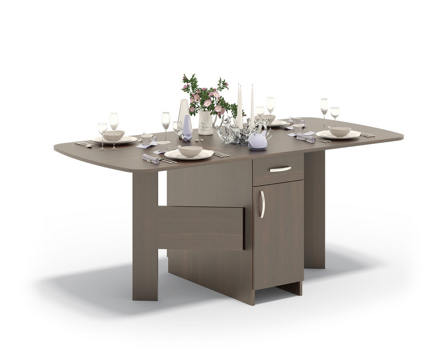 Многофункциональный стол-книжка с ящиками и полочками. Полезный элемент в квартире или загородном домике. В собранном виде может использоваться в качестве тумбы (ширина всего 382 мм). А при необходимости модель превращается в полноценный обеденный стол шириной 1760 мм.