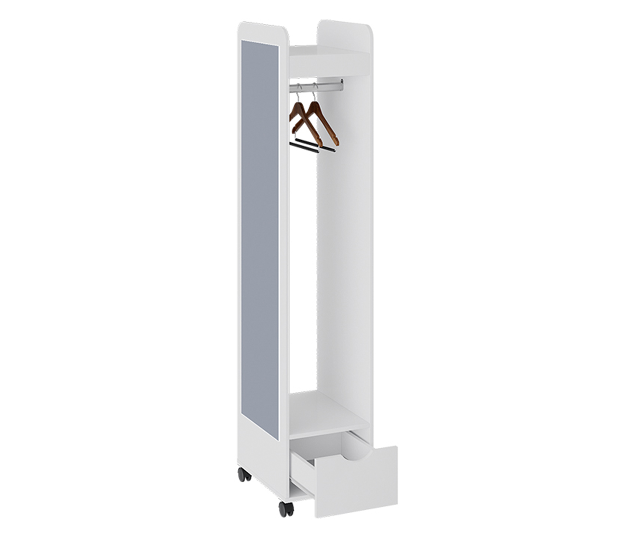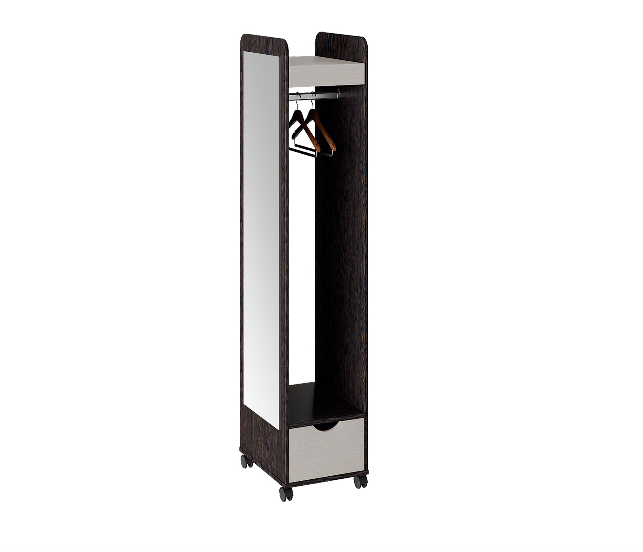 На боковой стенке вешалки находится зеркало. Вверху - полка для хранения головных убором, снизу у вешалки расположен выдвижной ящик для различных мелочей.
