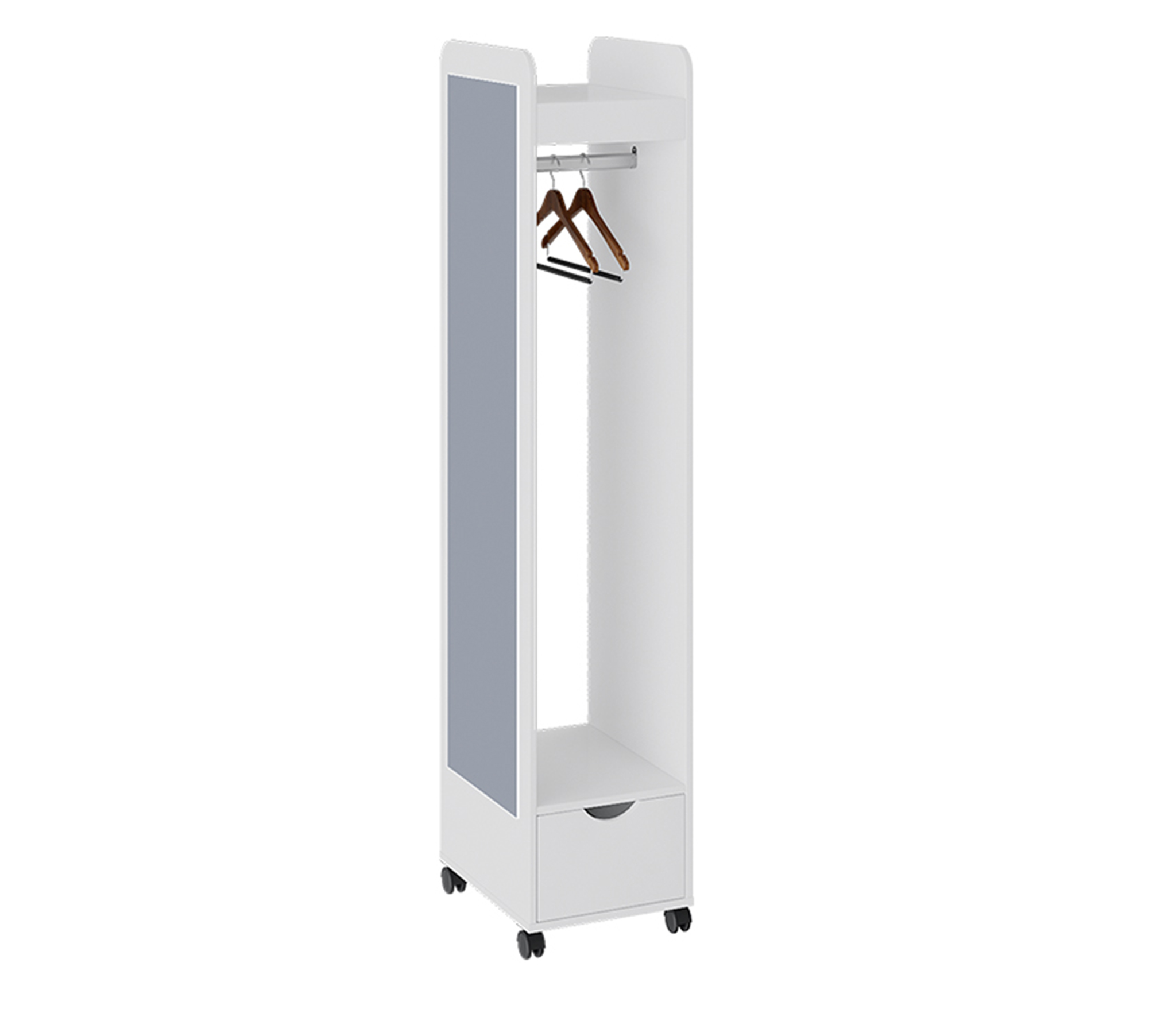 На боковой стенке вешалки находится зеркало. Вверху - полка для хранения головных убором, снизу у вешалки расположен выдвижной ящик для различных мелочей.