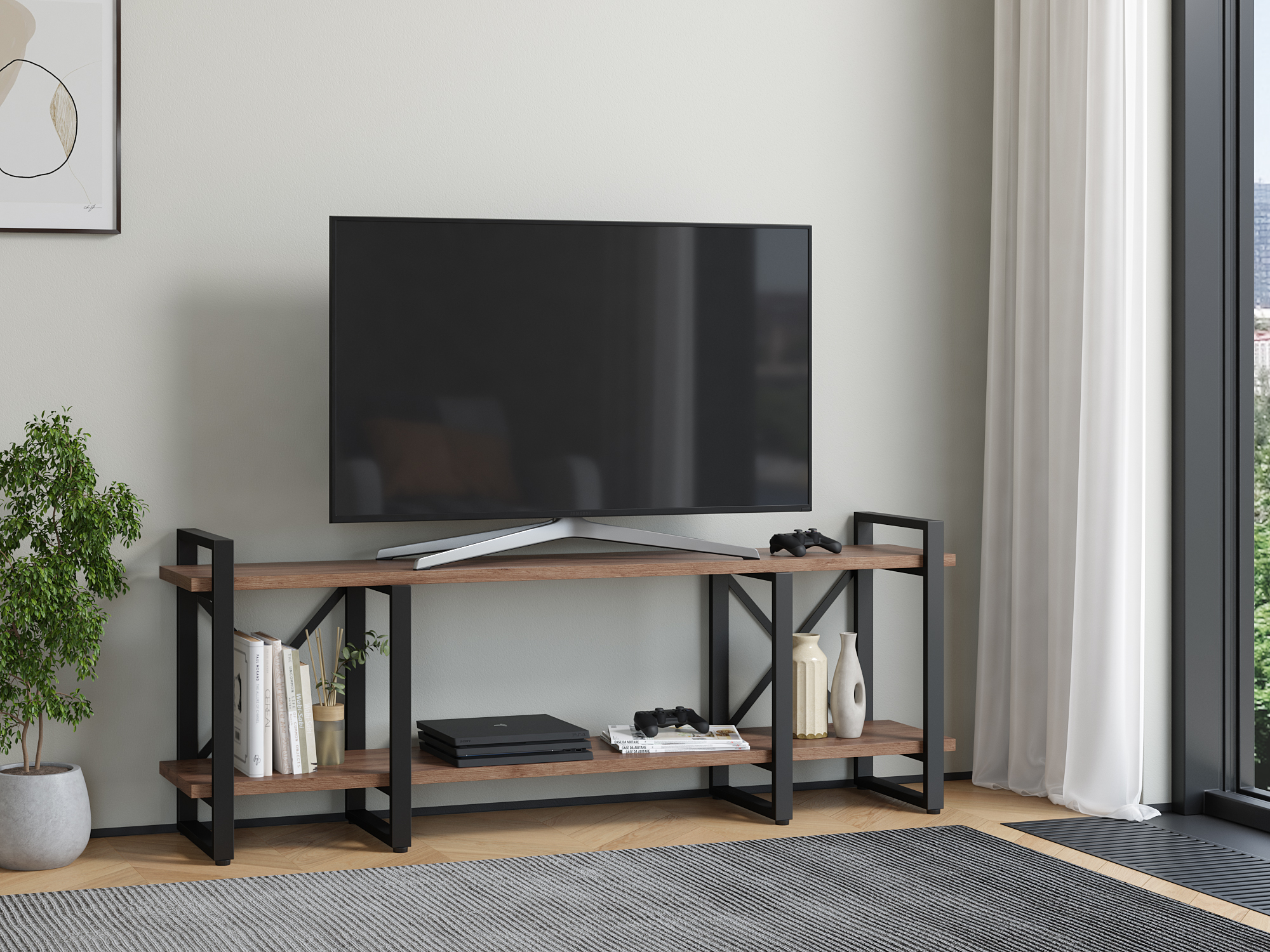 Тумба под ТВ Айсберг 160 в стиле лофт от Фабрики мебели 4 Сезона. Металлический каркас выполнен из металлического профиля 20х40 мм покрытого порошковой краской. Полки из ЛДСП 26 мм. Благодаря перекрестиям расположенным с задней части изделия конструкция надежная и без проблем выдержит нагрузку до 100 кг. Ножки имеют пластиковые опоры, регулируемые по высоте.