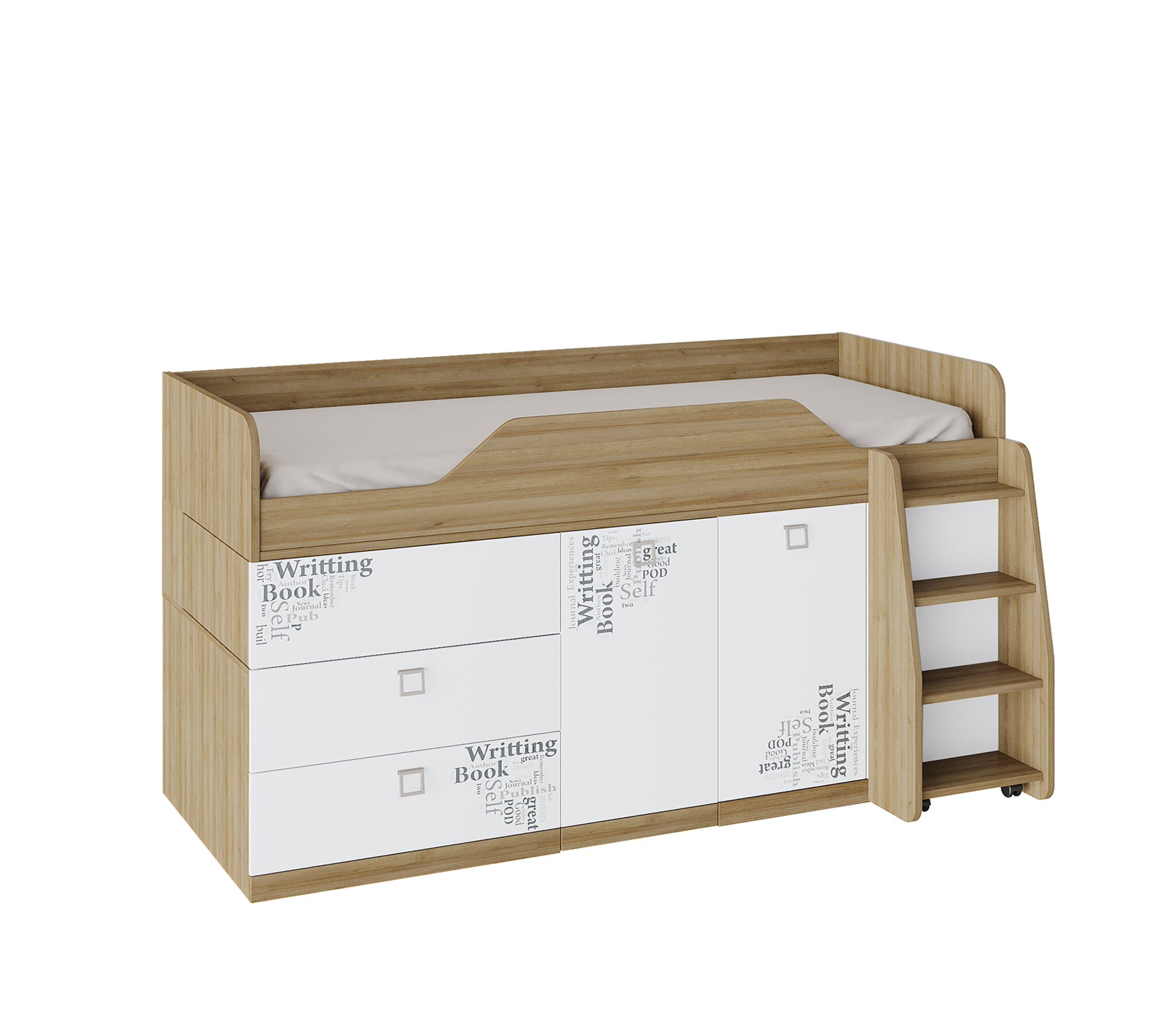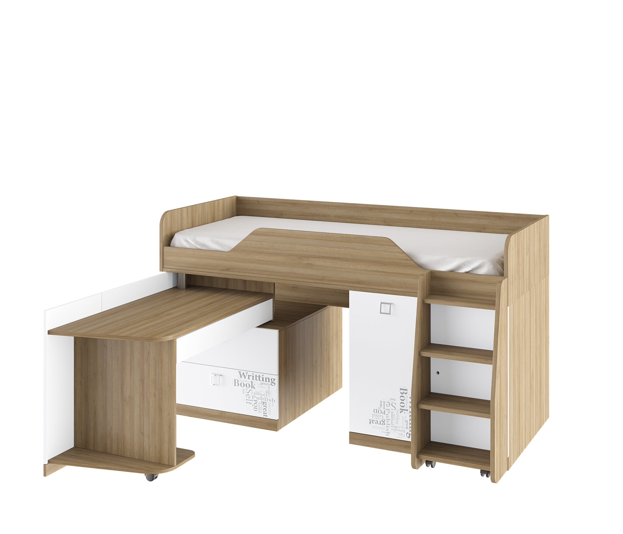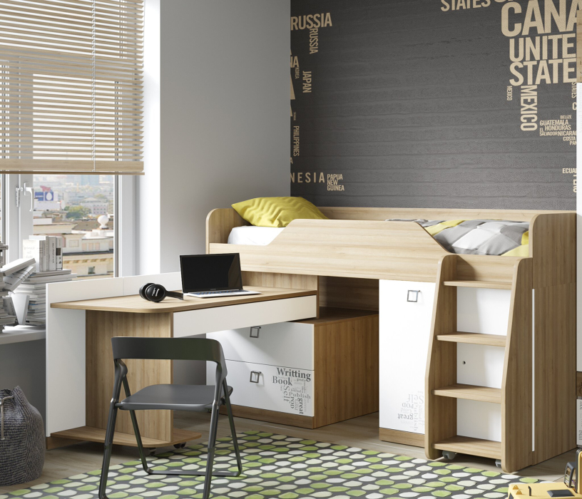 Кровать очень могофункциональна, подойдет для совсем небольших комнат. Одна кровать вмещает в себя несколько модулей: вместительный шкаф с полками (расположен за лестницей), выдвижные ящики - глубокие и вместительные, стол поворотный (легко задвигается под спальное место, если в нем нет необходимости), комфортное спальное место, расположенное на безопасной высоте для ребенка.
