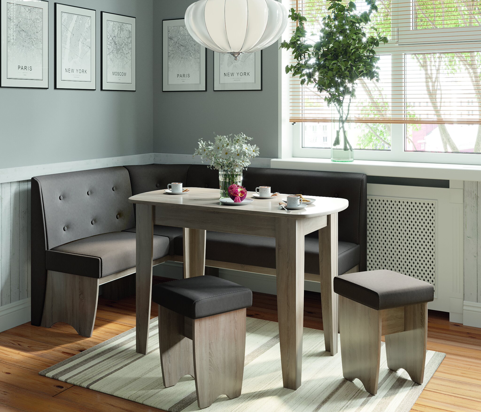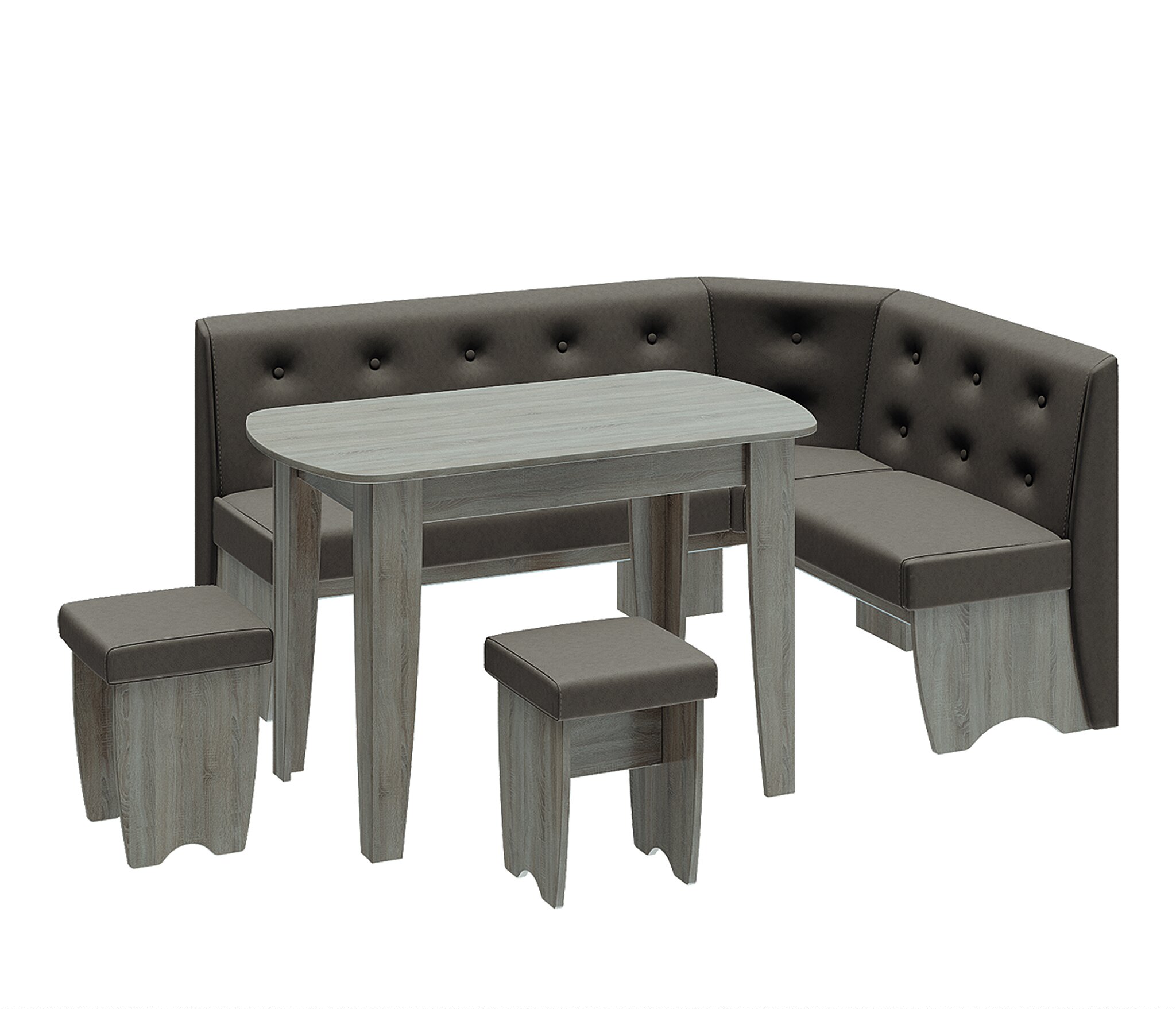 Классический кухонный уголок, уютный и практичный. Каркас: ЛДСП, обивка экокожа. Обработка торцов: кромка ПВХ. Скамья при сборке универсальна - как левый угол, так и правый. Под сиденьями скамьи располагаются вместительные ящики для хранения. Габариты скамьи: 160х120 см, высота 80 см. Габариты стола (не раскладной): 110х60 см, высота 73 см. Габариты табуретая: 33х33 см, высота 43 см. |