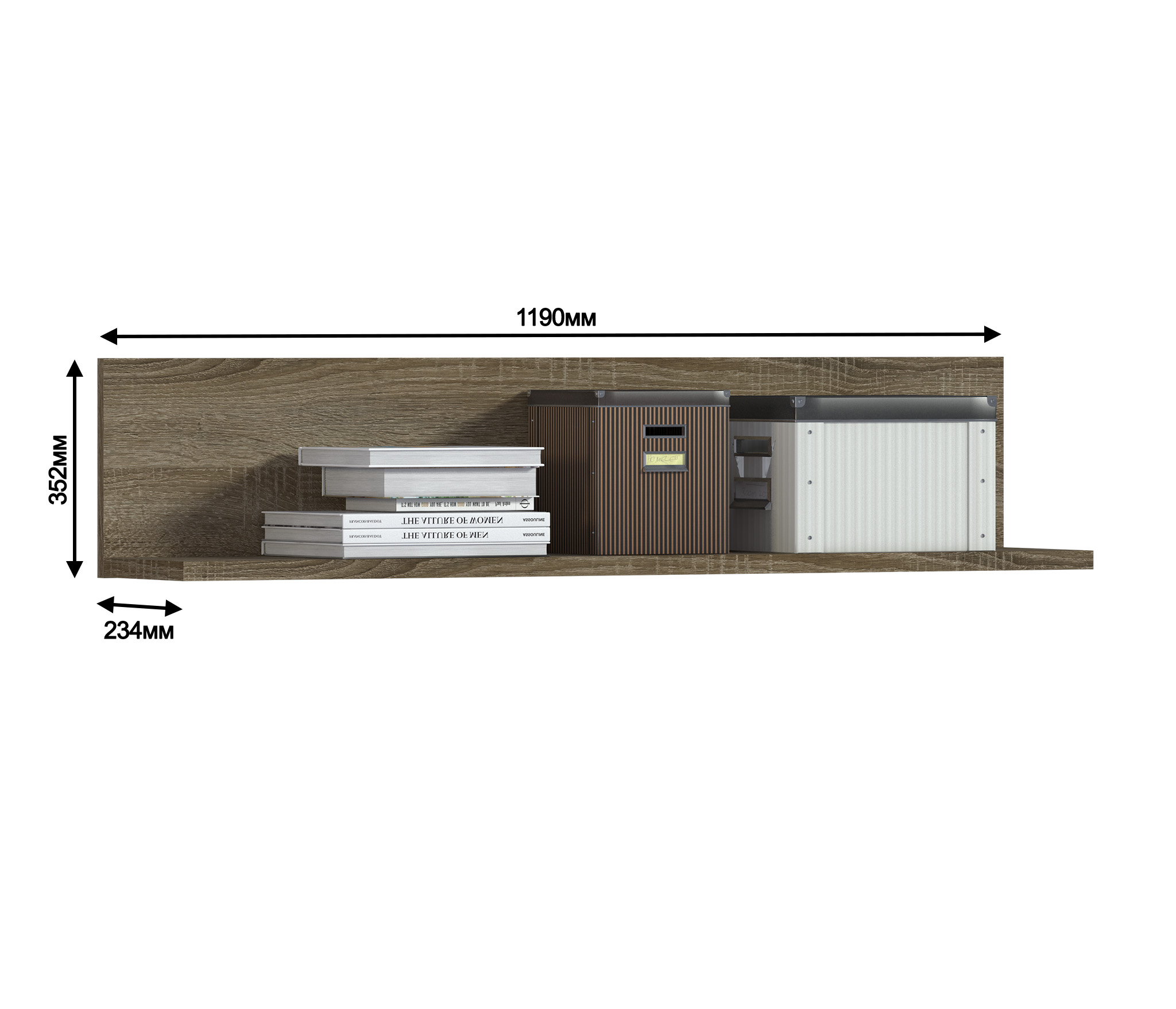 Габаритные размеры – ширина 119 см, высота 25 см и глубина 22 см. Выполнена полка из современного и прочного КДСП в цвете «Дуб Сонома Трюфель». Полка крепится к стене при помощи дюбелей, которые входят в комплект.