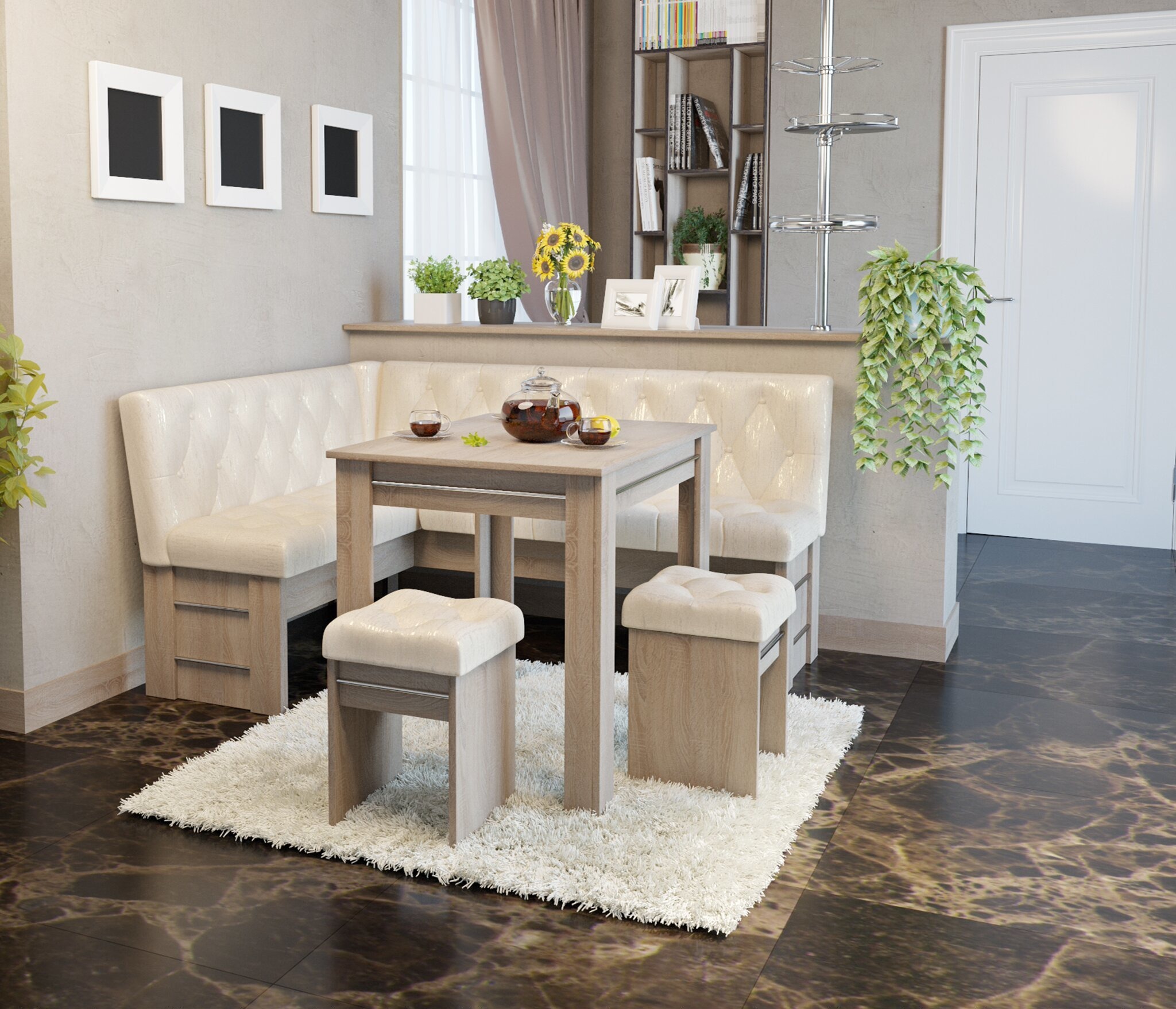 Набор включает в себя угловую скамью, стол и 2 табурета. Стол в наборе не раскладной, в скамье ящики не предусмотрены.
