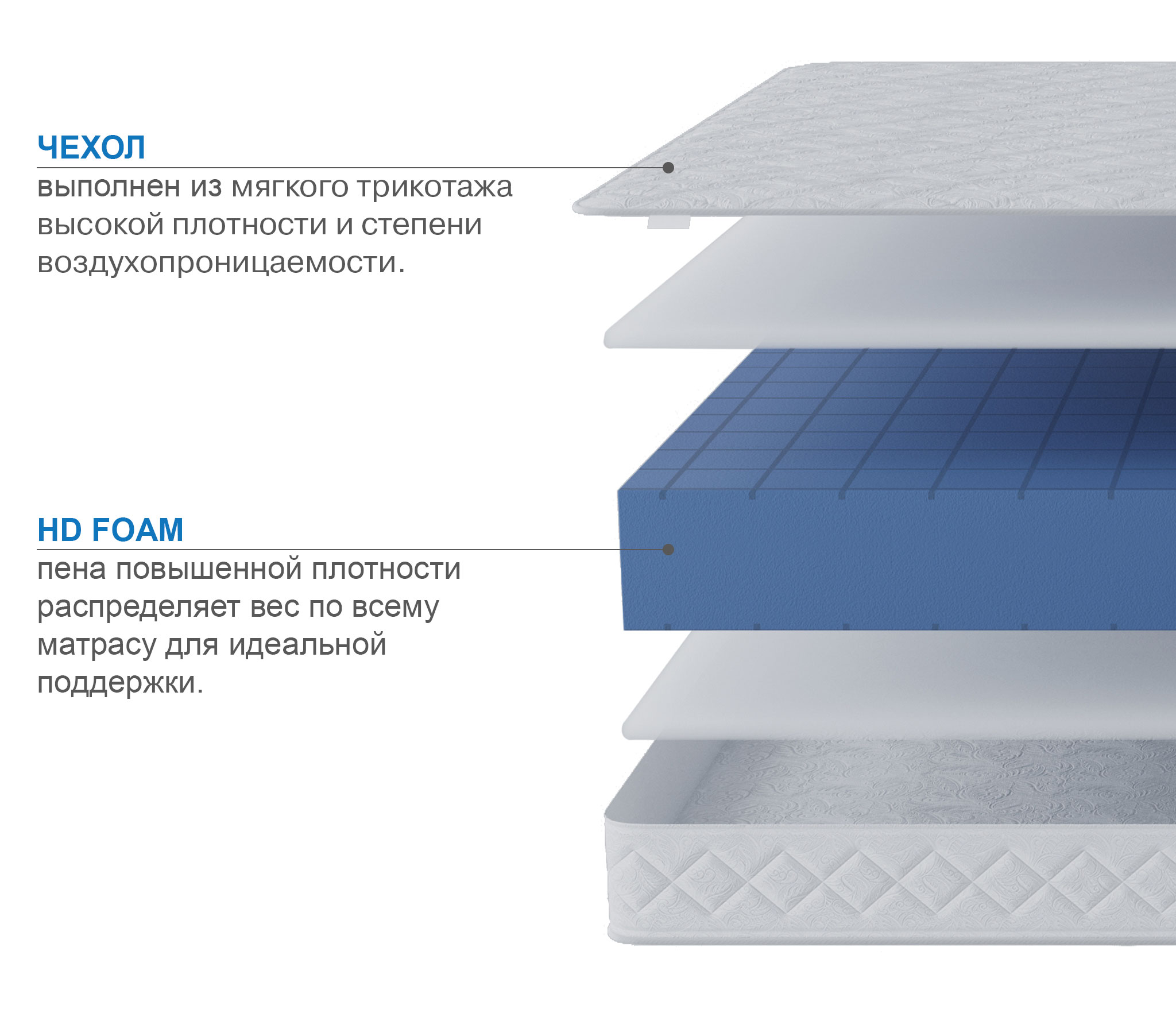 Первый и третий слои состоят из гипоаллергенной пены с прорезями ST Foam, которая создает комфорт и снимает напряжение со спины во время сна. Основа матраса - пена повышенной прочности HD Foam, принимает на себя основную нагрузку.