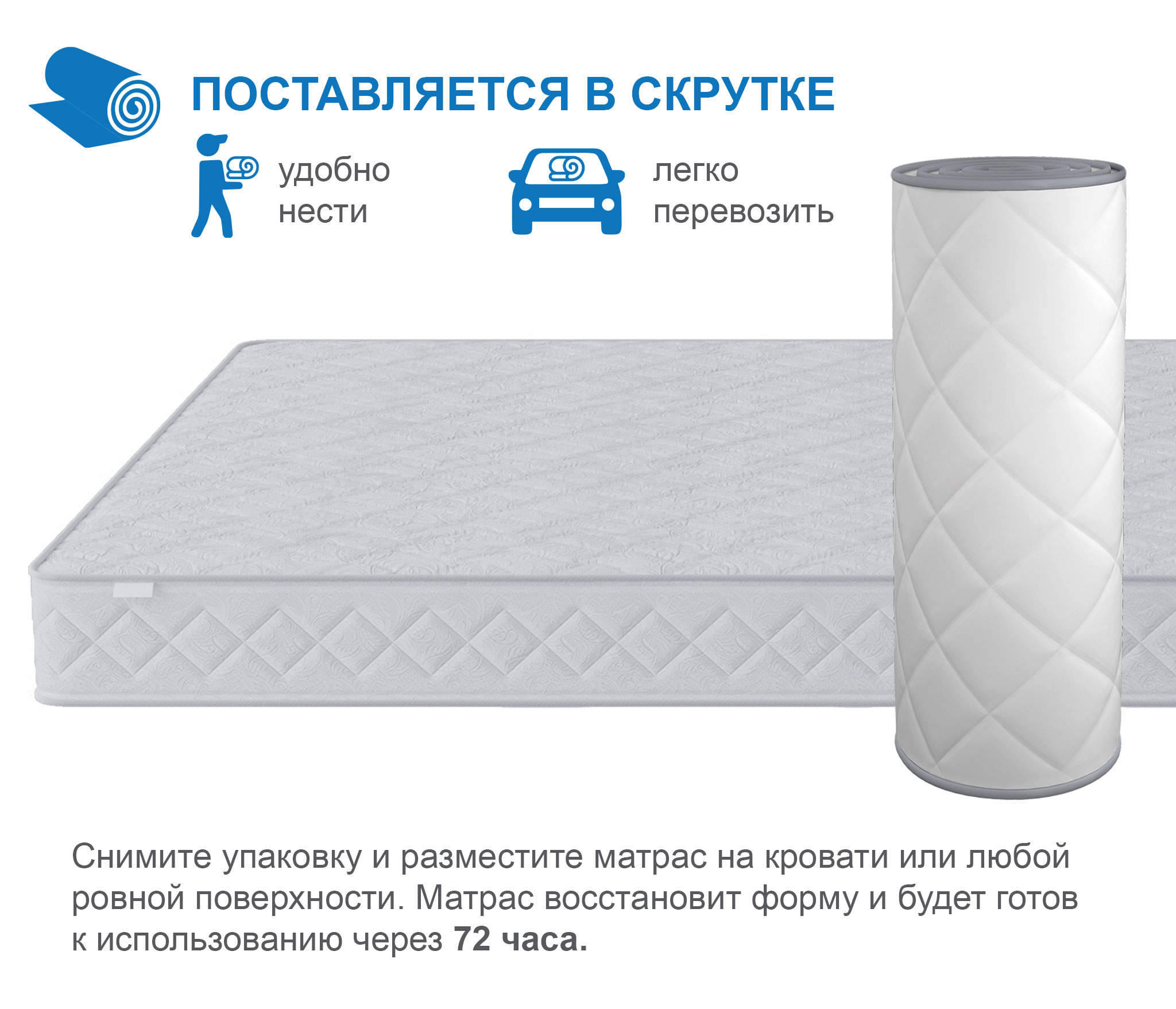 Матрас поставляется скрученным в рулон, что существенно упрощает его транспортировку, ведь в таком виде он войдет почти в любую легковую машину. Матрас восстановит форму и будет готов к использованию через 72 часа.
