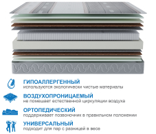 С обеих сторон матраса в качестве комфортного слоя используется 2 см искусственного латекса, этот материал очень долговечный и упругий, благодаря этому слою на этом матрасе будет одинаково комфортно людям разных весовых категорий. Для распределения нагрузки и придания необходимой жесткости используется латексированный кокосовый лист, который кладется под латекс. В основе матраса лежит блок независимых пружин, благодаря которому матрас будет индивидуально подстраиваться под каждого спящего и оказывать обратное давление только там, где это действительно необходимо. Чехол матраса сделан из плотного мягкого трикотажа, который стегается на 15 мм пене и синтепоне, что добавляет не много мягкости. Обращаем ваше внимание на то, что любой матрас отвечает за правильность положения во время сна нижнего и среднего отделов позвоночника, а за правильность положения шейного отдела отвечает правильно подобранная ортопедическая подушка. Рекомендуем использование с защитным чехлом AquaStop.