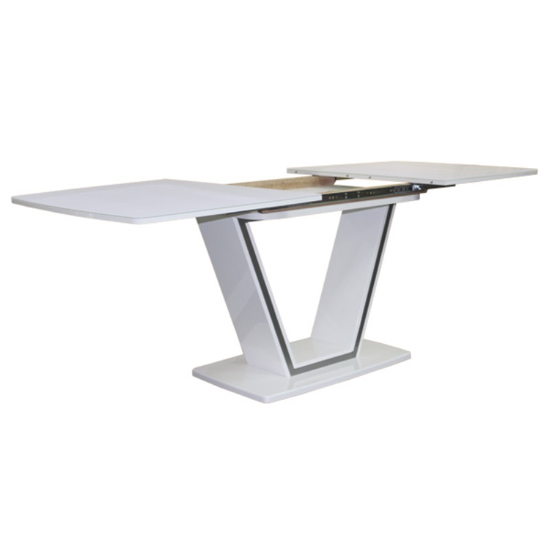 Столешница - закаленное стекло. Подстолье - массив бука + МДФ в покраске белый лак с хромированной декоративной вставкой.