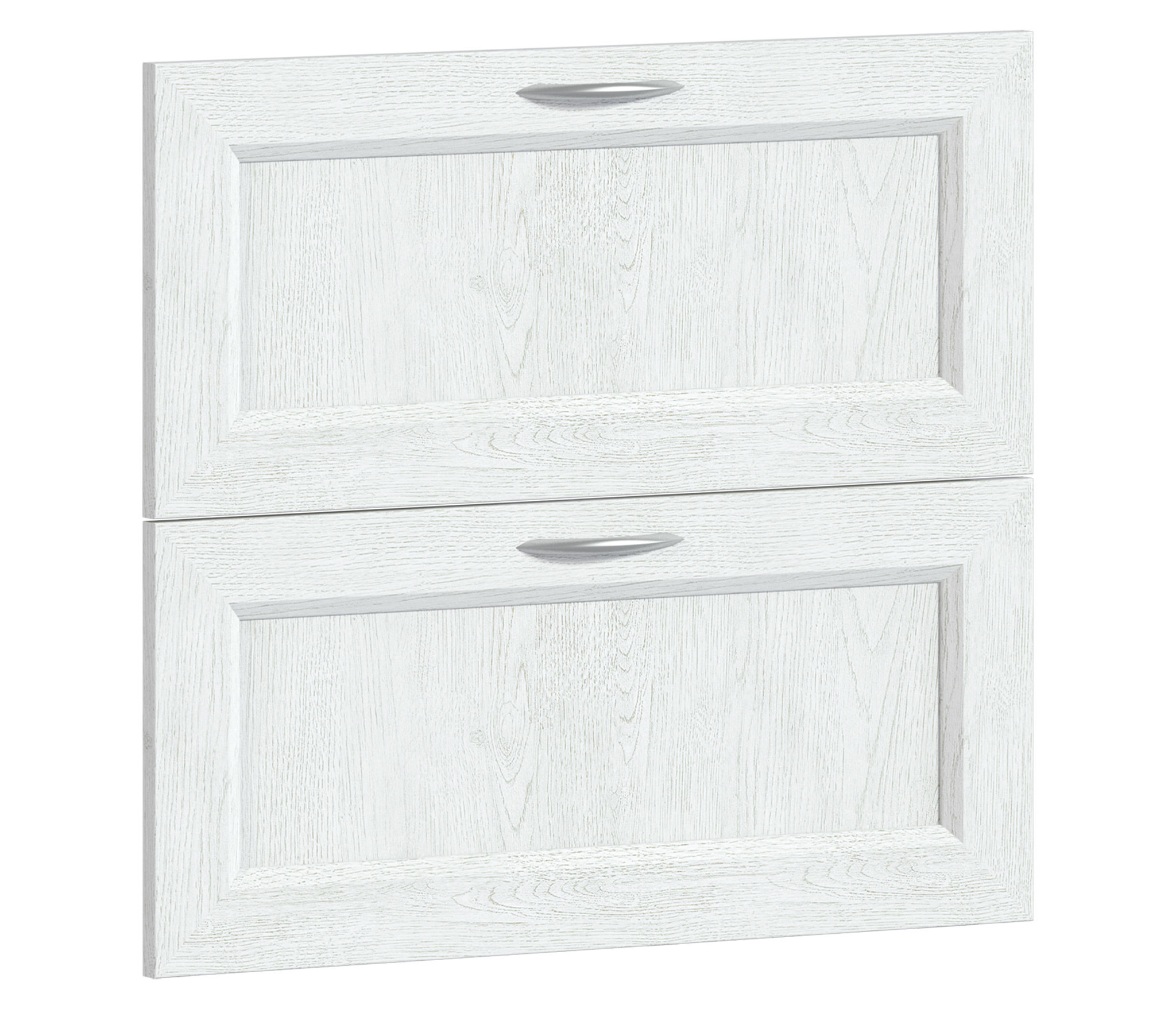 Две панели для ящиков шкафа. Они изготовлены из прочной и экологически чистой прессованной древесины. Панели устойчивы к воздействию воды и пара. Каждая панель дополнена двумя ручками в классическом стиле.