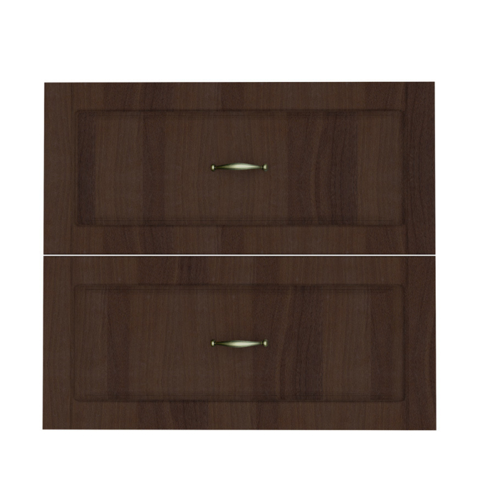 Две панели для ящиков шкафа. Они изготовлены из прочной и экологически чистой прессованной древесины. Панели устойчивы к воздействию воды и пара. Каждая панель дополнена двумя ручками в классическом стиле.