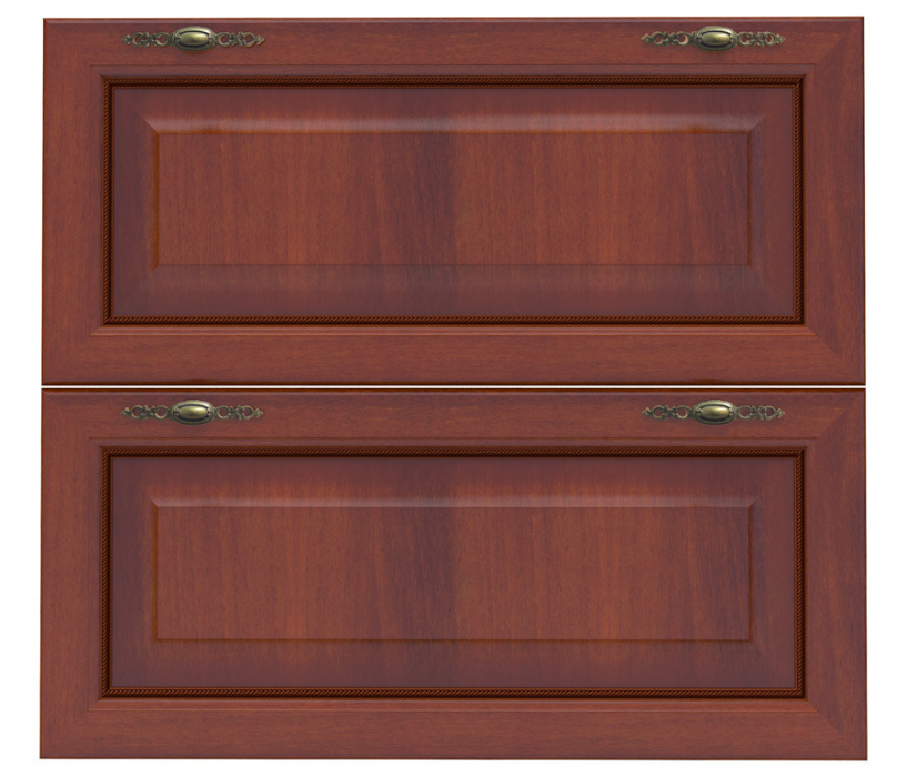 Две панели для ящиков шкафа. Они изготовлены из прочной и экологически чистой прессованной древесины. Панели устойчивы к воздействию воды и пара. Каждая панель дополнена двумя ручками в классическом стиле.