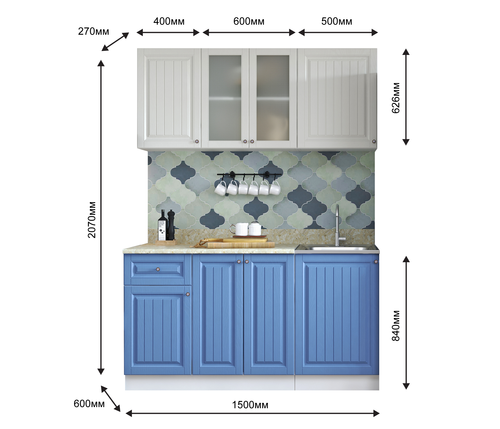 два верхних шкафа - общая ширина 1000мм (400-глухой , 600-со стеклом) и на 500мм. Высота 626мм. Глубина 270 мм.