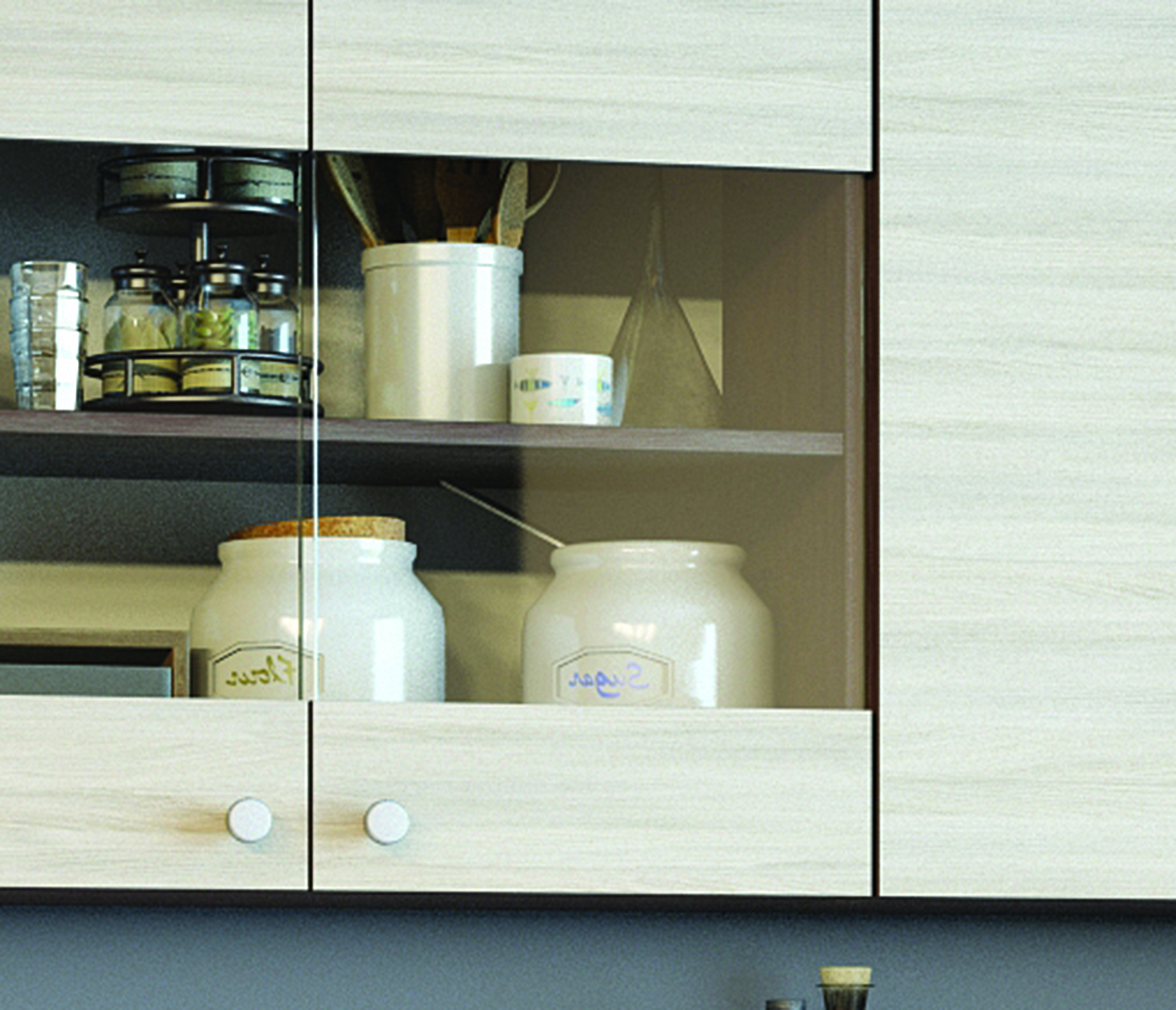 три верхних шкафа - на 800мм с распашными дверцами, на 800мм со стеклом и на 400мм с одной дверцей. Высота 626мм. Глубина 290 мм.