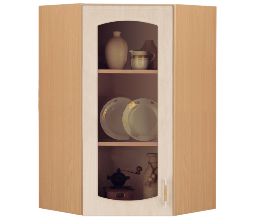 Аккуратный угловой шкаф для эргономичной кухни. Он не занимает много места и отлично выглядит. Дверца шкафа с тремя отделениями застеклена. Все детали шкафа выполнены из экологичных и качественных материалов.