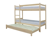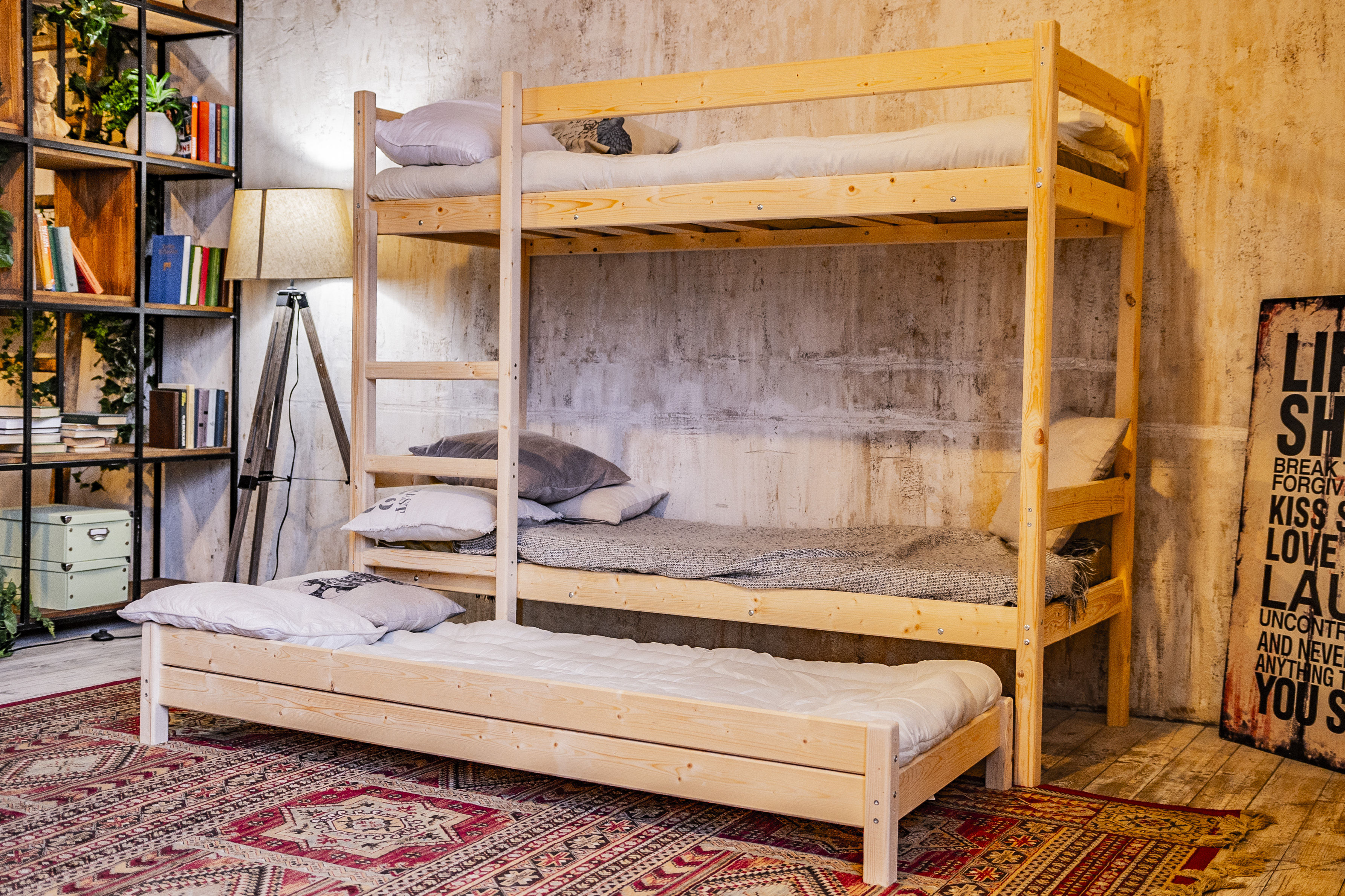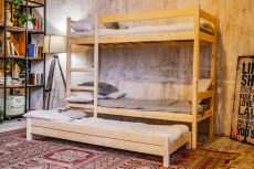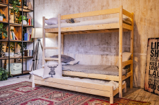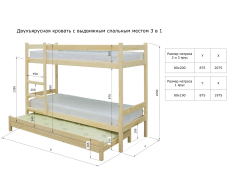 Модель кровати в два яруса с дополнительным спальным местом выдвижного типа 3-в-1. Данная конструкция отличается высокой степенью эргономичности и компактности, а также прочности и долговечности.