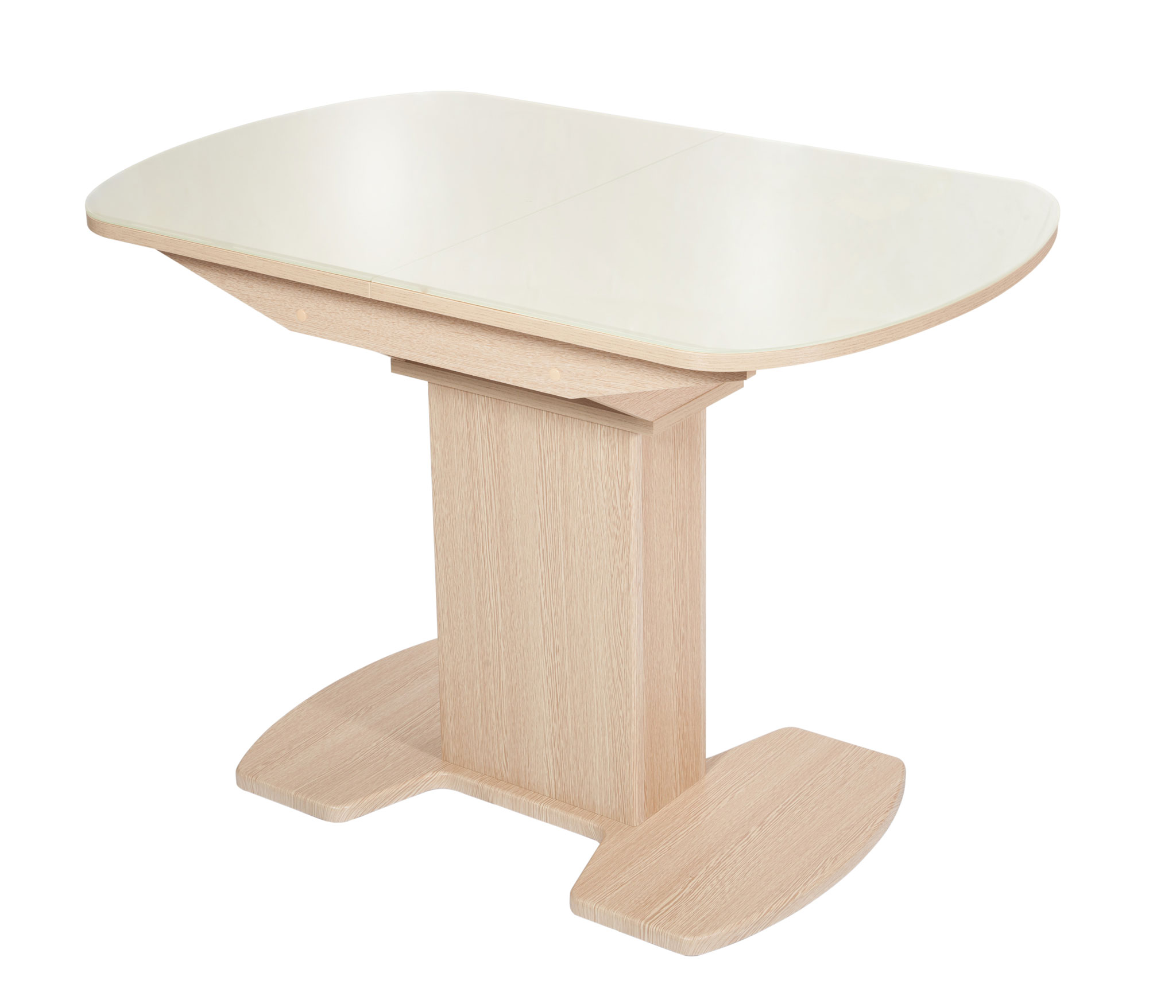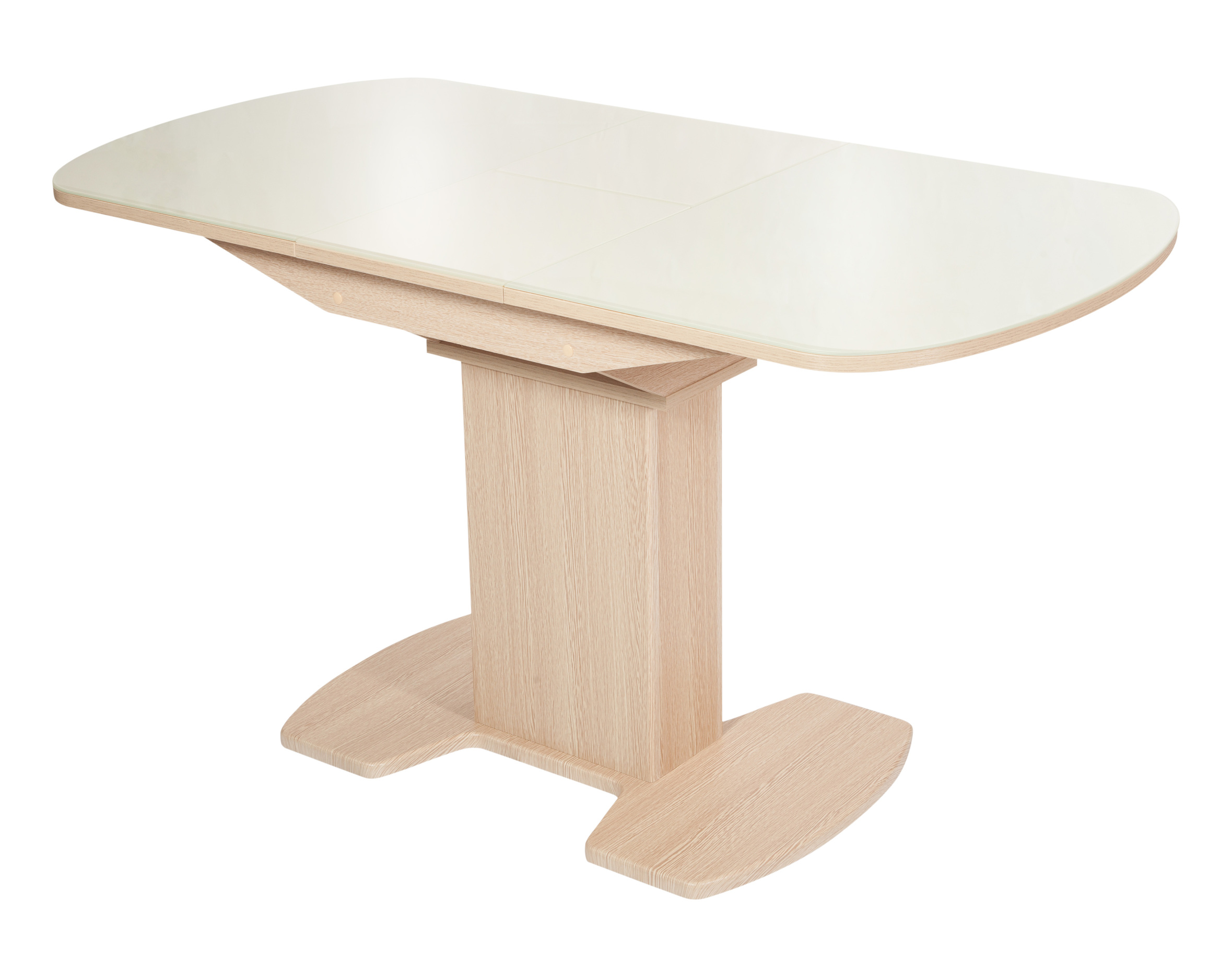 Раскладной обеденный стол со стеклянной столешницей. Основание выполнено из МДФ, обтянуто пленкой ПВХ вцвете дуб выбеленный. Столешница - плита МДФ (22мм) покрыта закаленным стеклом (4мм). Синхронный механизм раскладывания и вставка-бабочка позволяют увеличить длину столешницы на 31,5 см. Габаритные размеры (см): Длина: 110/141,5; Ширина: 70; Высота: 74,2