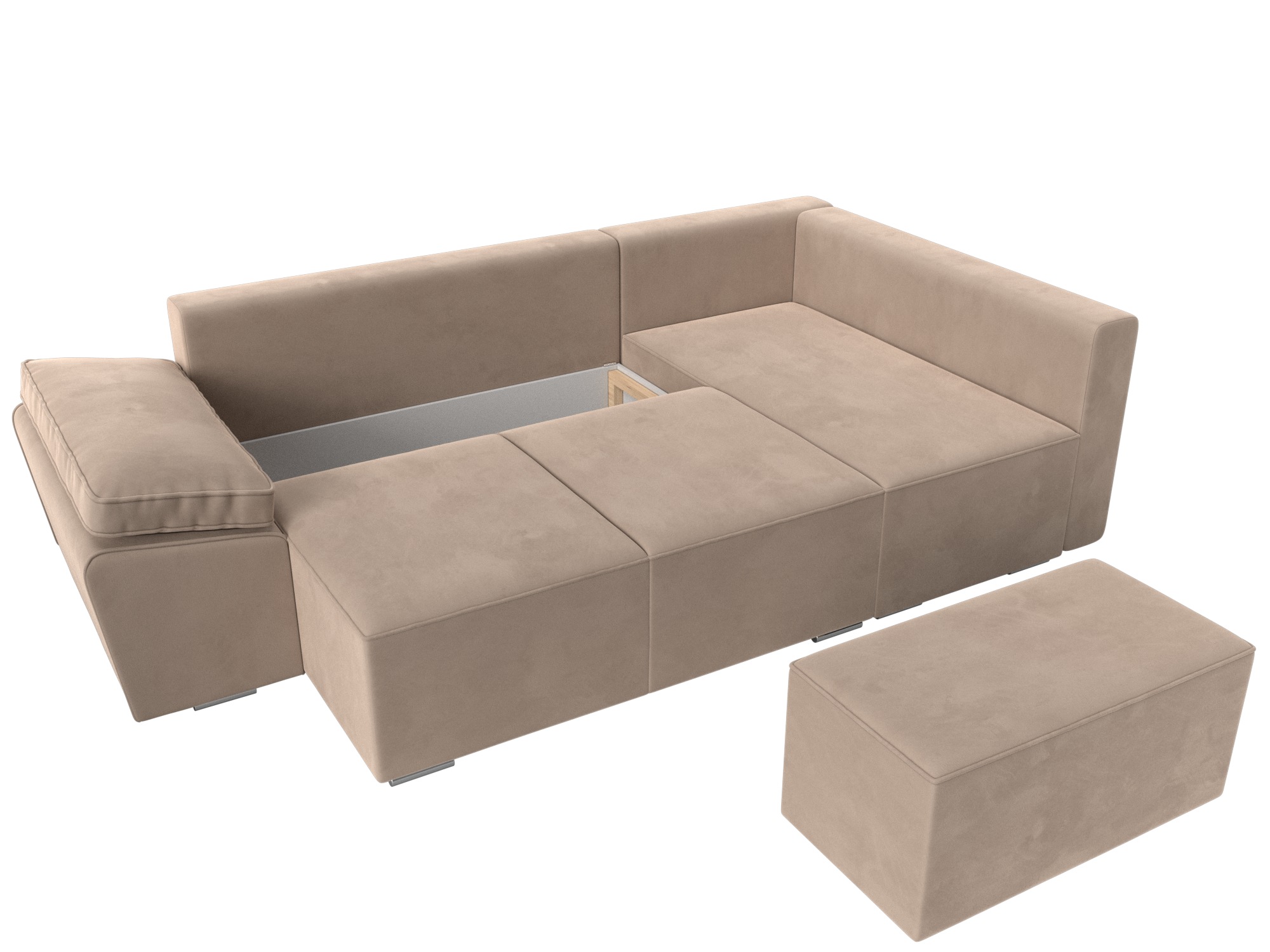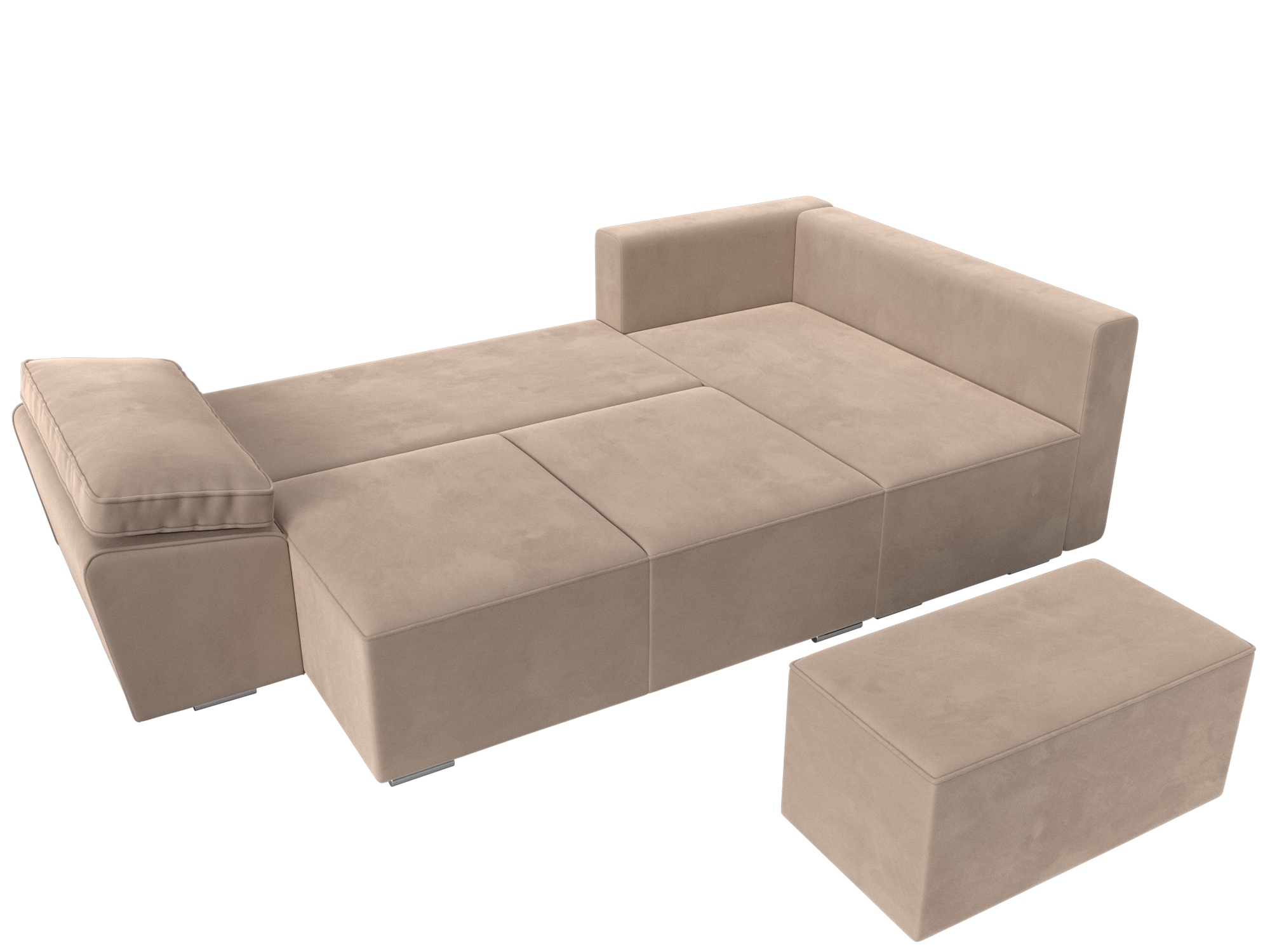 Хьюго – недорогой угловой диван с раскладным механизмом и необычным дизайном. Он дополнен одним подлокотником, созданным в форме подушки. Угол оборудован приставным пуфиком. Дополнительное преимущество - глубокий ящик для белья.