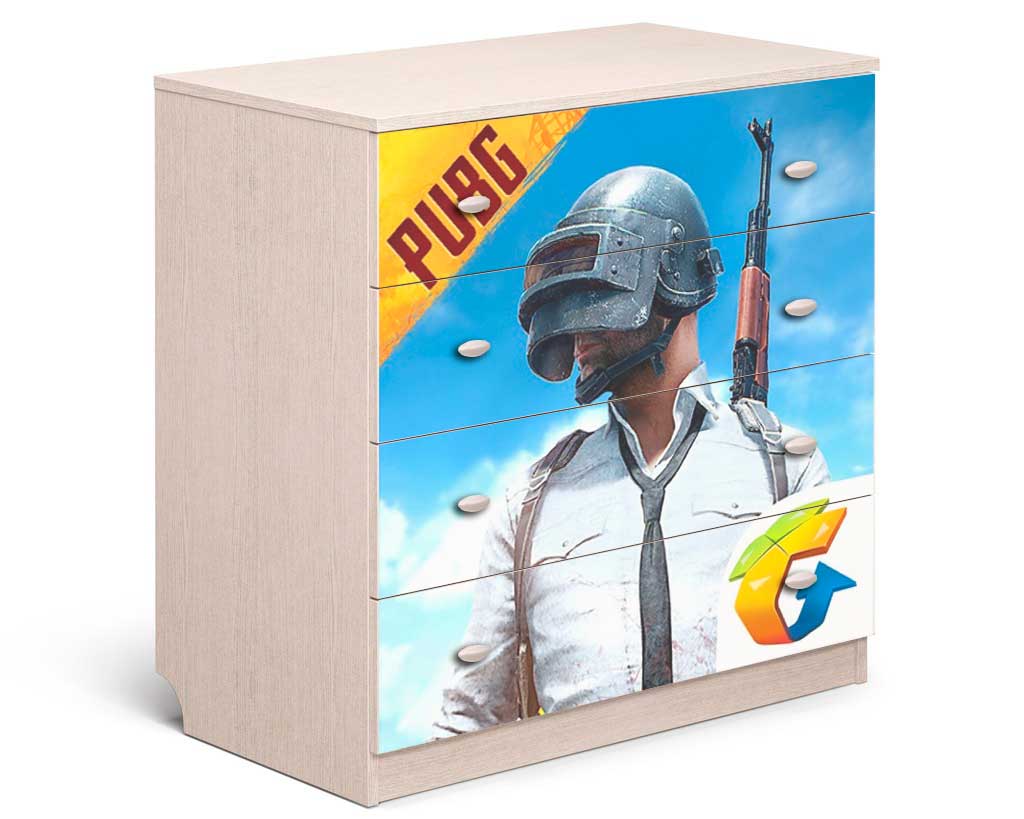 Комод оснащен четырьмя ящиками и выполнен в пастельном цвете Дуб беленый. Оригинальность комоду придает фотопечать с персонажами одноименной игры. Корпус и фасад изготовлены из материала ЛДСП+фотопечать.