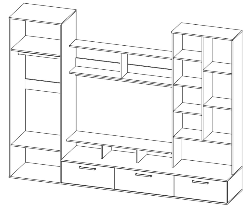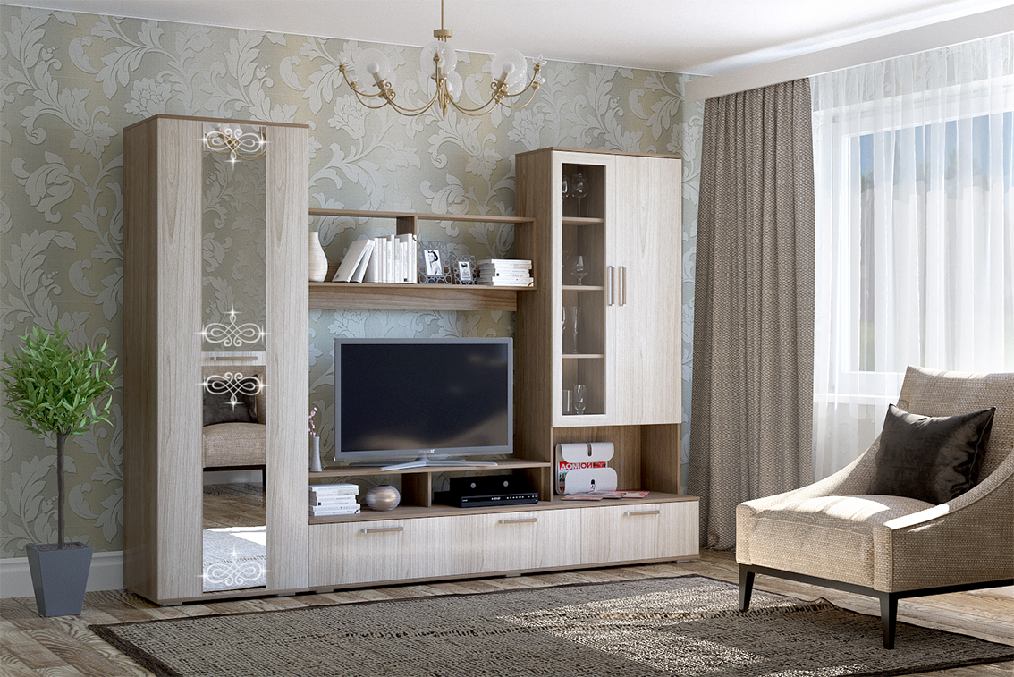 Удобная и практичная гостиная Николь 6 в современном стиле. Включает в себя: вместительный шкаф для одежды, оснащенный широкой штангой и двумя полками. Фасад шкафа имеет зеркальную вставку, выполненную в полный рост и дополненную нежным узором. Секцию со стеллажом. За стеклянной витриной располагаются четыре полки, на которых отлично разместятся книги или посуда. Правая секция стеллажа за глухой дверцей имеет три полки. Две подвесные полки и широкую ТВ-тумбу с несколькими секциями для хранения всех необходимых вещей. Размер ниши под ТВ 1340*815 мм. Гостиная выполняется в двух цветовых решениях: Шимо темный/Шимо светлый и Венге/Дуб молочный. Материал изготовления ЛДСП.