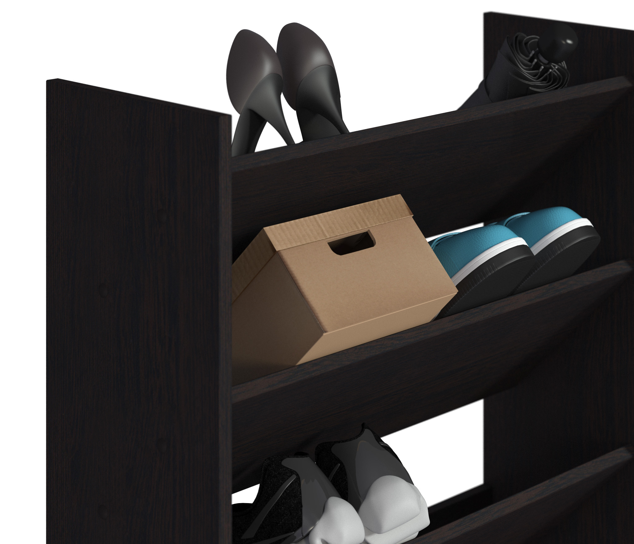 Обувница Дельта СБ-2130 выполнена в минималистичном дизайне, оснащена тремя полками и впишется в интерьер небольшой прихожей. ¶Габаритные размеры – ширина 71 см, высота 90 см и глубина 27 см. Благодаря продуманной конструкции этот функциональный предмет мебели даст возможность аккуратно хранить до 12 пар обуви. На открытых полках обувь всегда будет быстро высыхать и проветриваться. ¶Обувница выполнена в цвете «Венге» из экологичного современного КДСП.