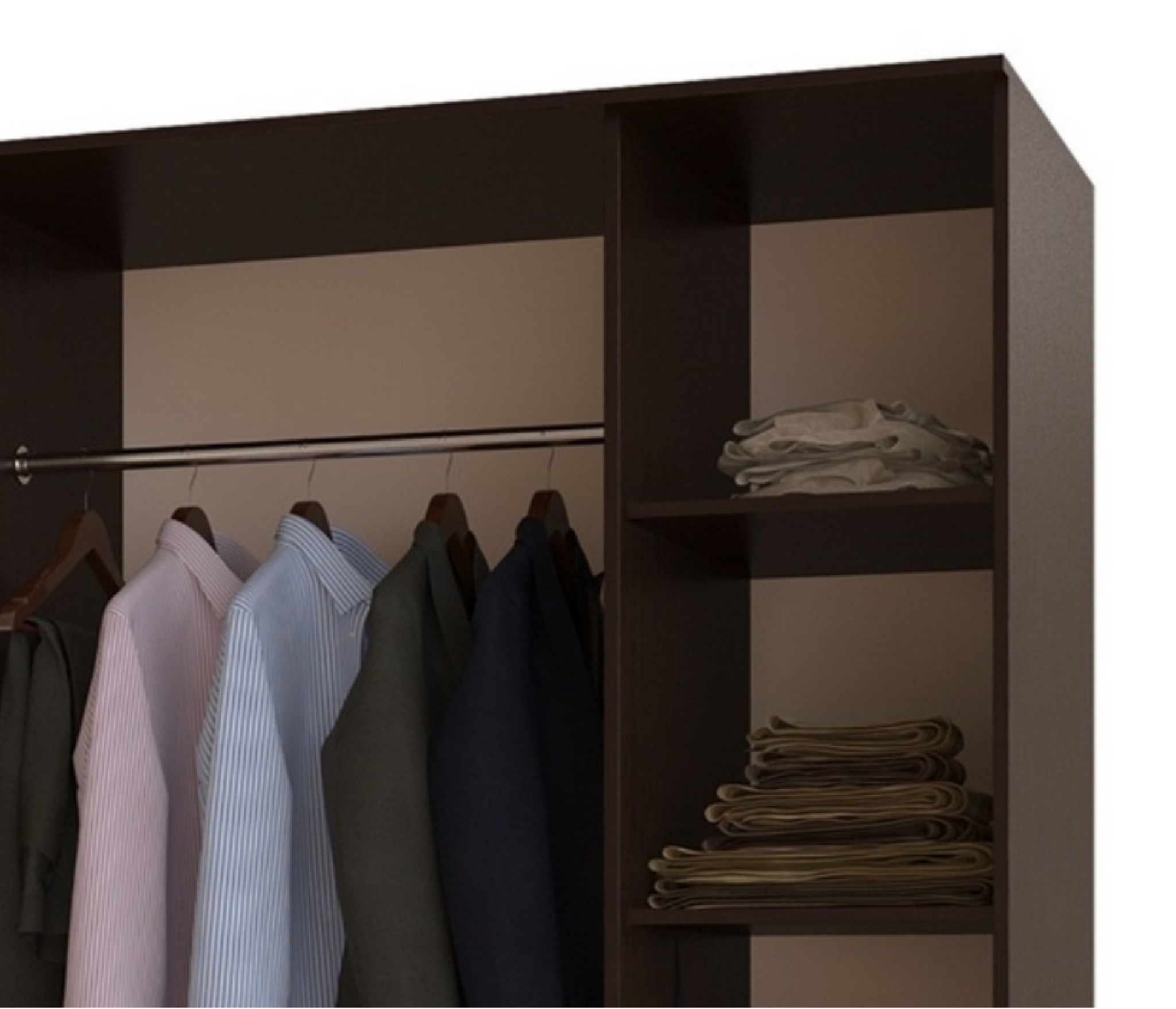Комплектация представляет собой центральную зону с двумя нижними выкатными ящиками и отделения со штангой для одежды на плечиках.
