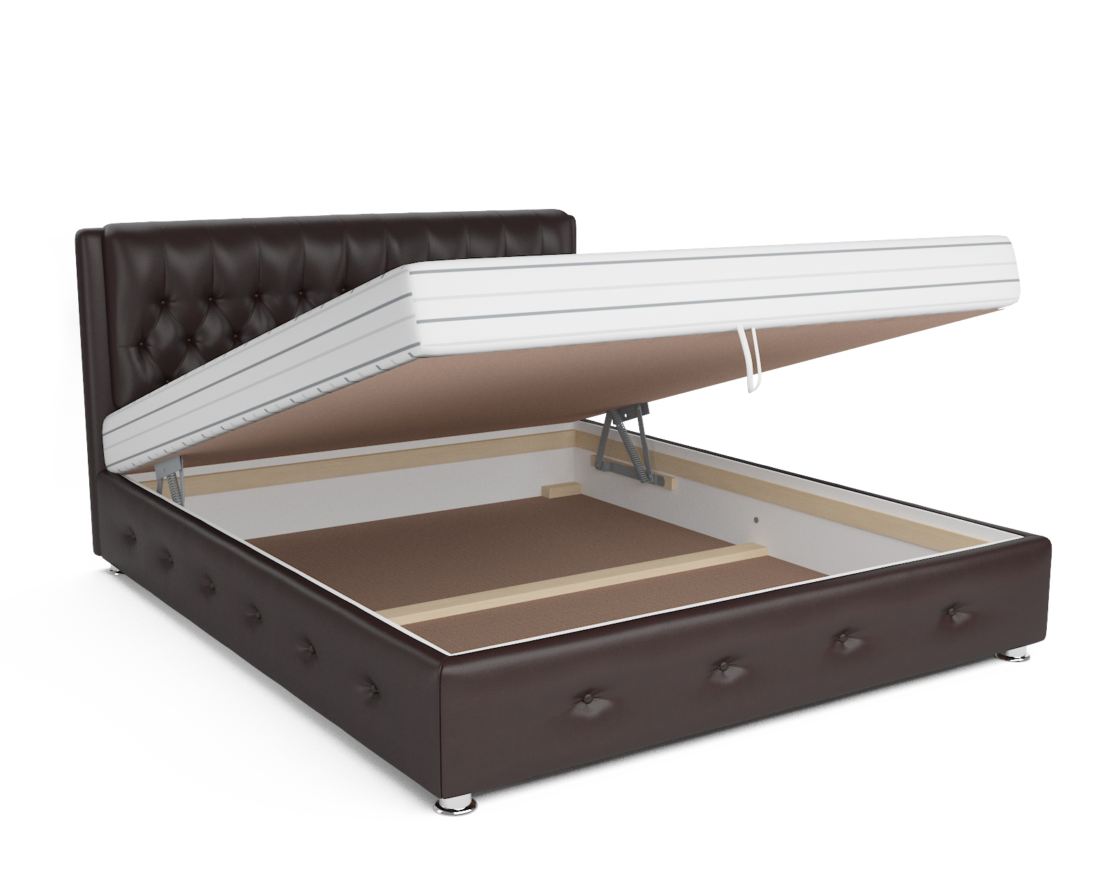 Механизм с упругими элементами под матрасом обеспечивает быстрый и легкий подъем спального основания. За ним скрыт вместительный бельевой ящик, предоставляющий дополнительное пространство для хранения.