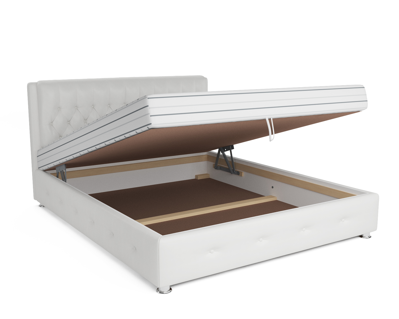 Механизм с упругими элементами под матрасом обеспечивает быстрый и легкий подъем спального основания. За ним скрыт вместительный бельевой ящик, предоставляющий дополнительное пространство для хранения.
