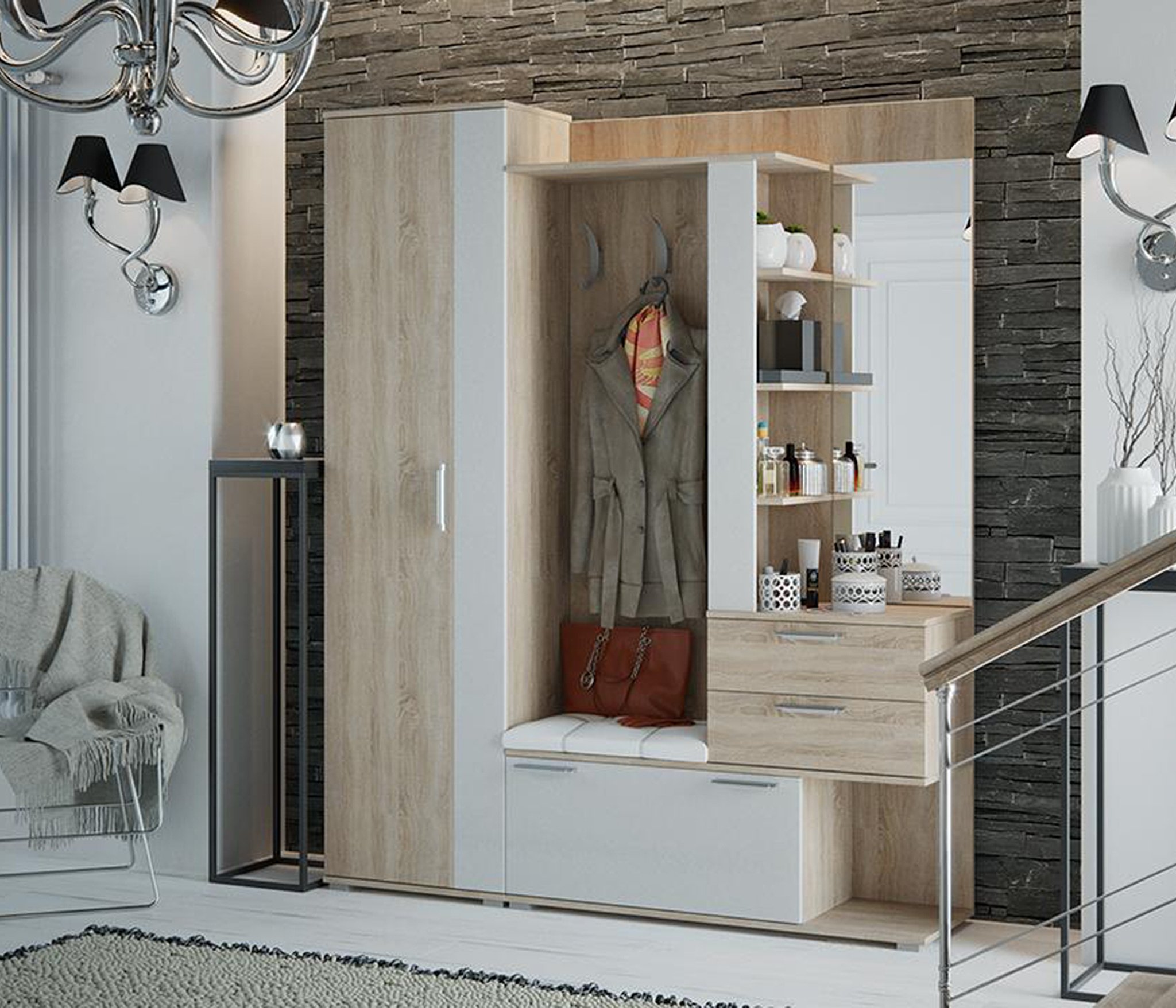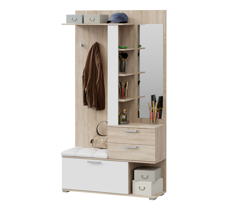 Обувница с мягким сиденьем, открытая секция для верхней одежды, выдвижные ящики и антресольные полки для головных уборов, открытые полки.