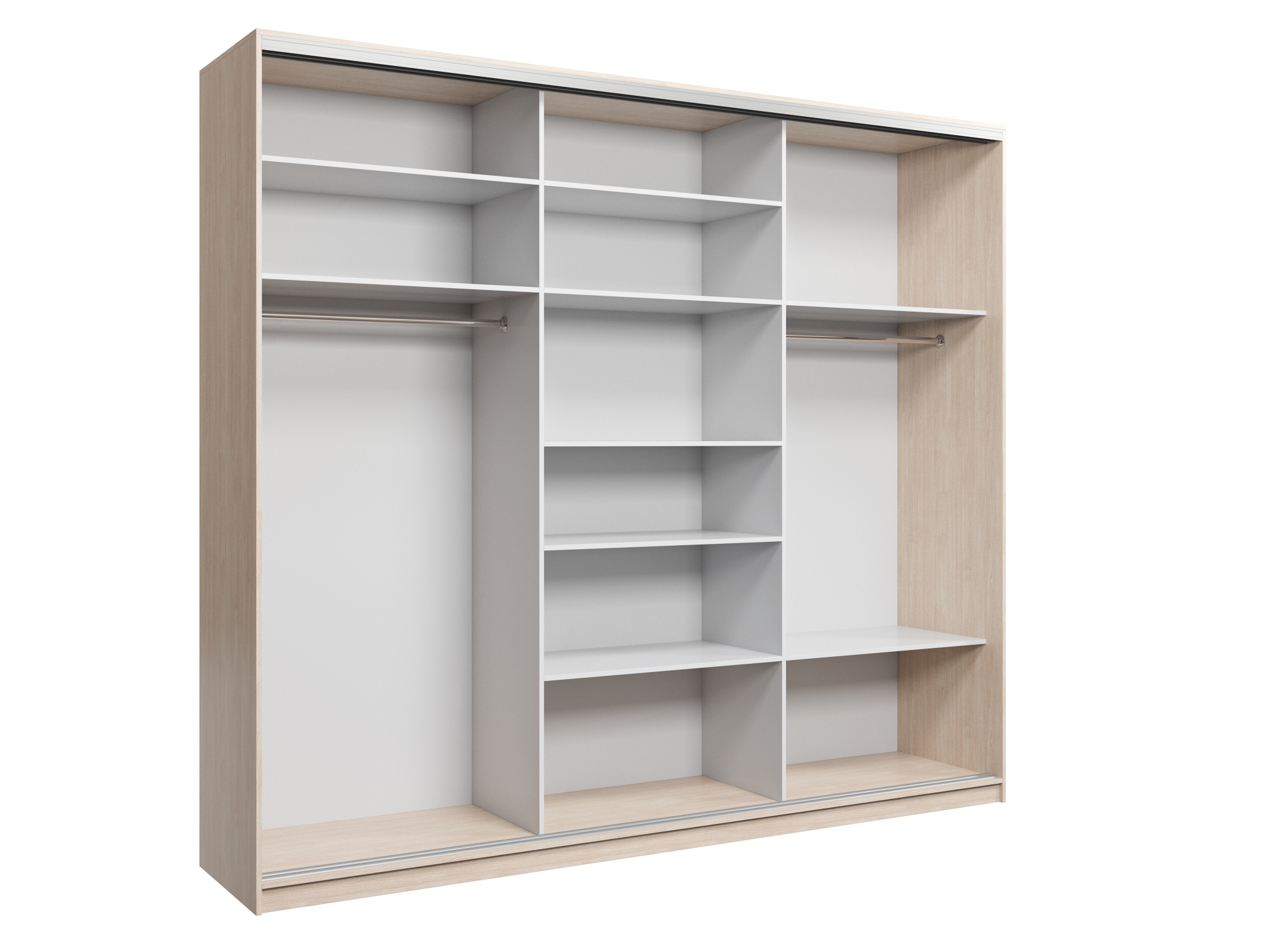 Шкаф купе Айсберг является одной из самых продаваемых моделей. Внутреннее пространство, включает в себя большое количество разных полок и отделение с штангой для вешалок. Модель выполнена из качественного ЛДСП толщиной 16 мм. а современная фурнитура, придает абсолютно тихий ход дверям.