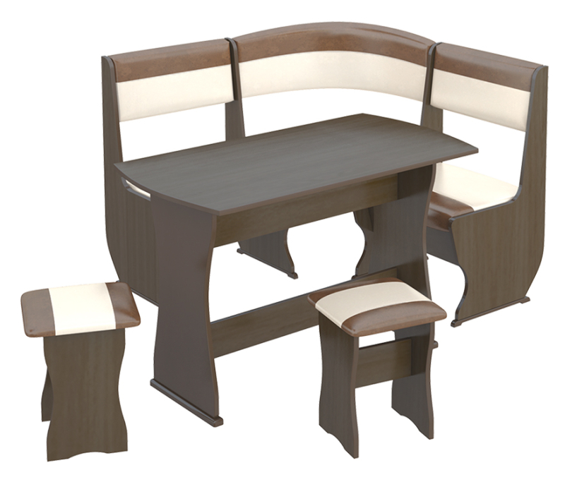 Габаритные размеры (ВхШхГ): 1100х1100х800ммКоричневая обивка в сочетании со светлым буком придает уют кухне и подчёркивает оригинальный дизайн этого компактного уголка. Модель станет идеальным решением обустройства обеденной зоны даже в небольшой по размерам кухне, так как занимает совсем немного места, обладая при этом максимальной функциональностью. В комплект входит: стол -1 шт., табурет - 2 шт., угловая скамья - 1 шт. размеры (1100×1100×800 мм).