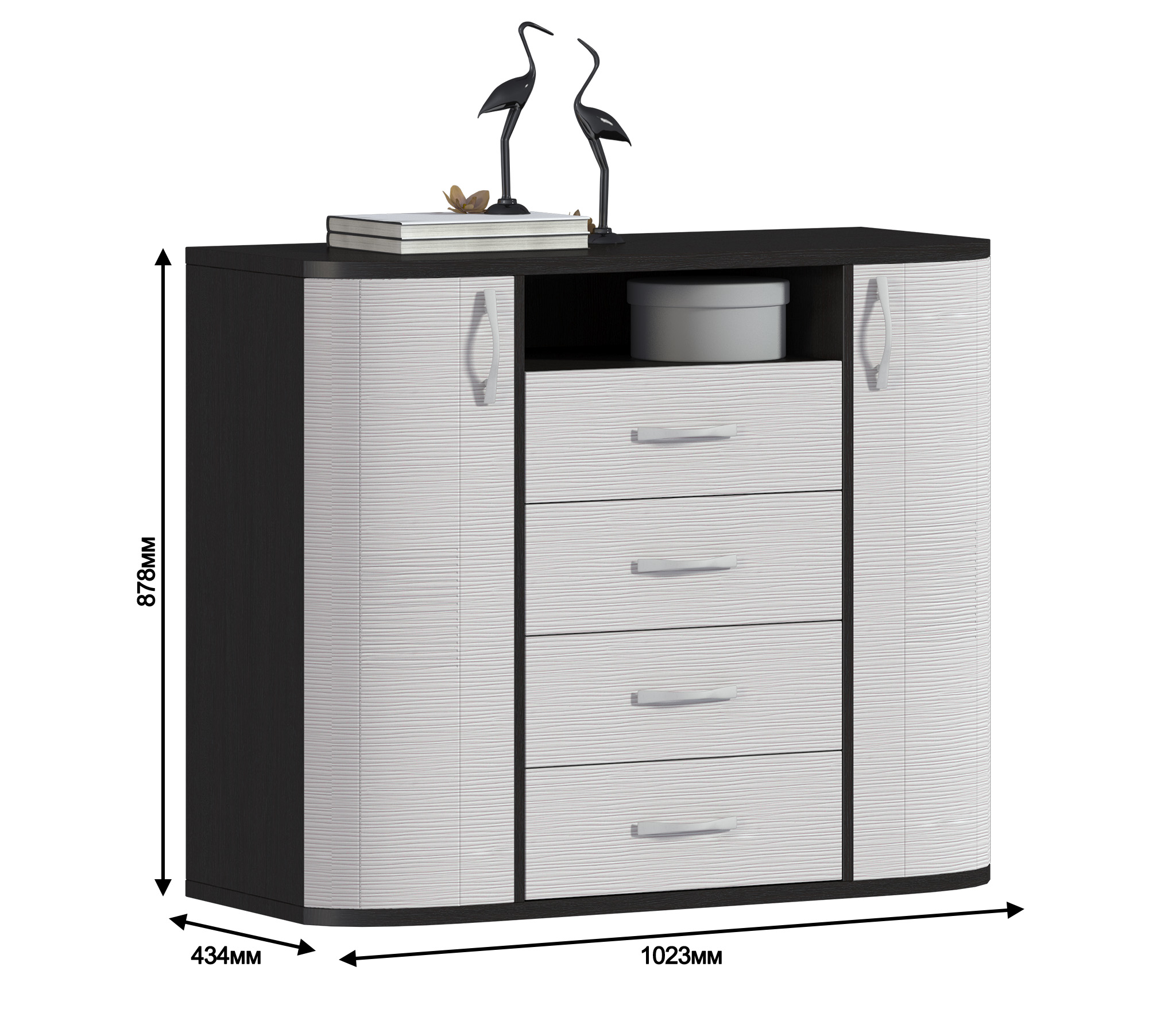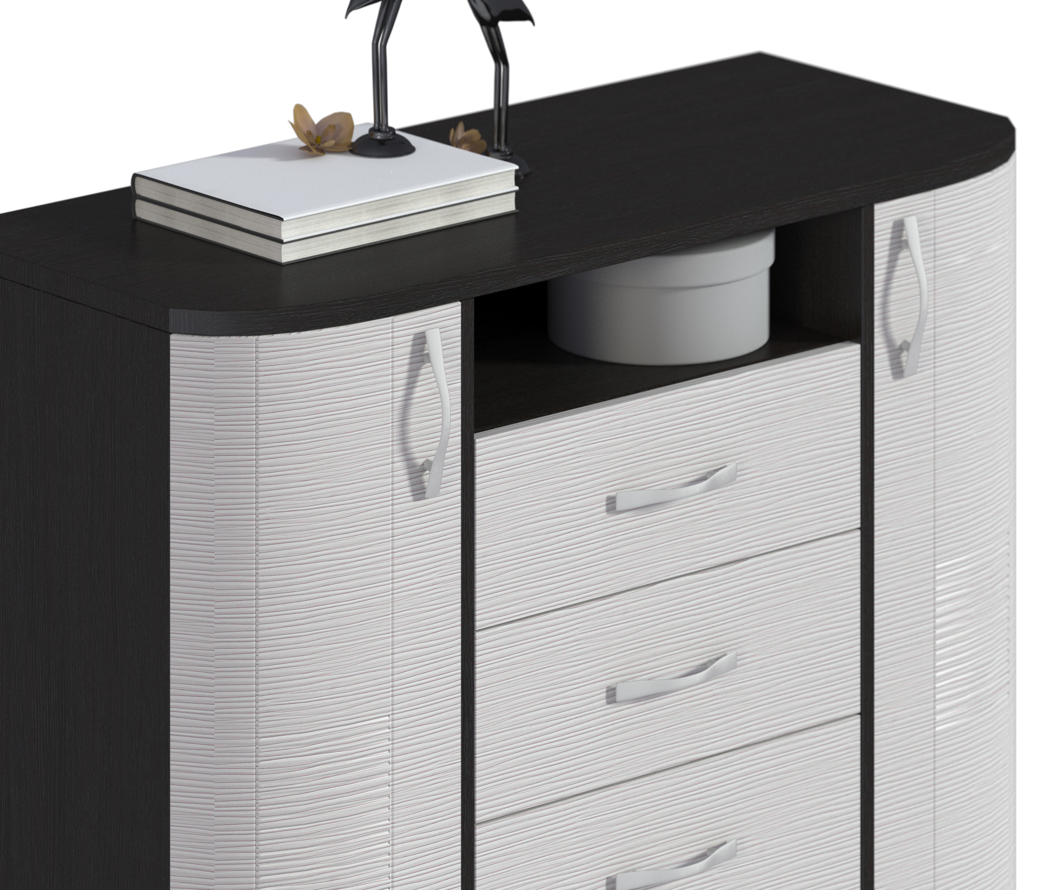 Комод очень понравился. Стильный, современный, закругленные боковинки. Хорошо смотрится и сам по себе и в сочетании с другой мебелью из этой серии. Удобные ящики с хорошими направляющим. Сверху широкая столешница особо порадовала. Покупкой довольны. Рекомендуем.