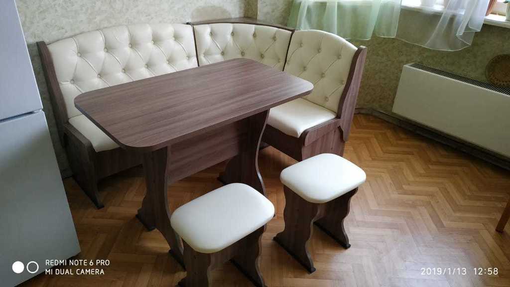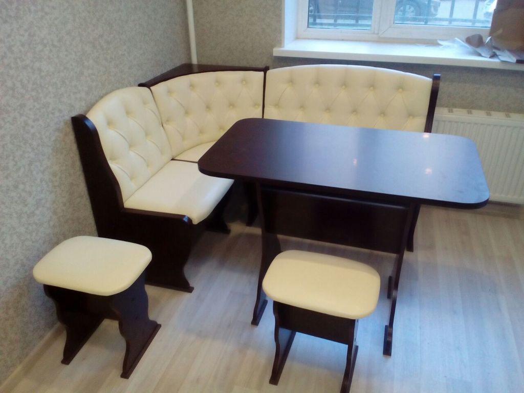 Набор мебели для кухни с классической красивой каретной стяжкой, включающий в себя угловую скамью, стол и два табурета.