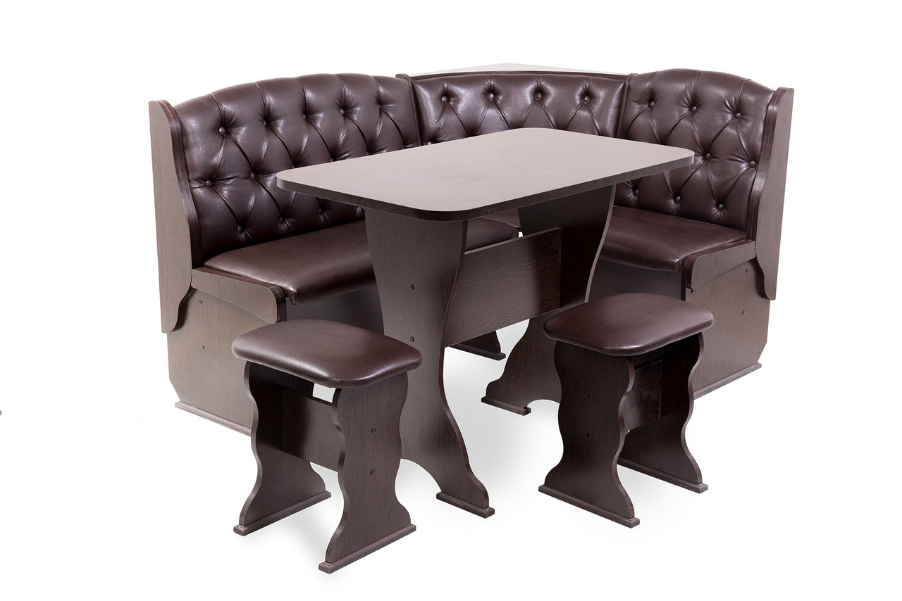 Набор мебели для кухни с классической красивой каретной стяжкой, включающий в себя угловую скамью, стол и два табурета.