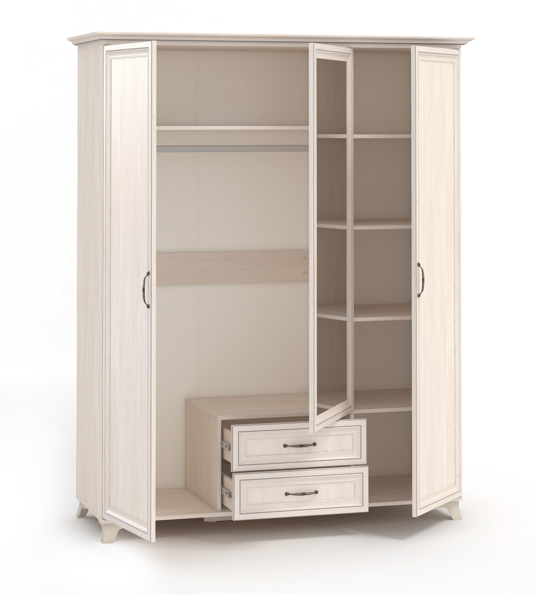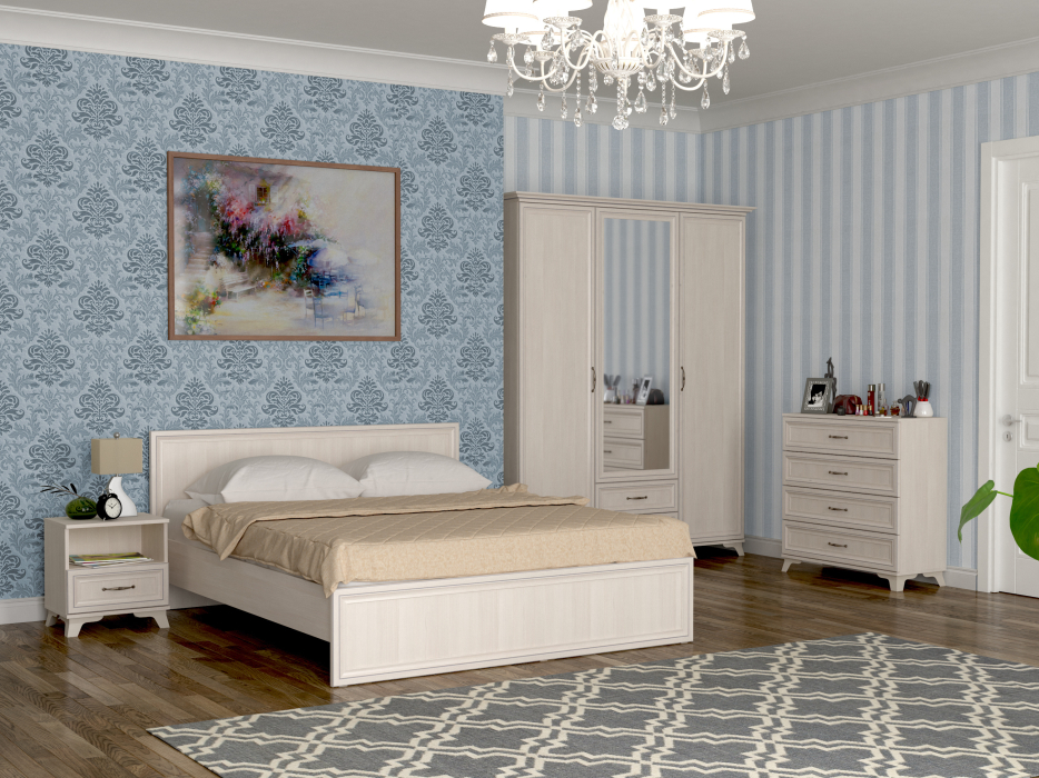 Спальное место: 1600х2000 мм. Ортопедическое основание входит в комплектацию. Матрас приобретается дополнительно. Спальня Ариэль - это роскошный, современный спальный гарнитур. Мебель изготавливается в красивом модном цвете, благодаря которому, в Вашей спальне будет светлее и уютнее. Спальня Ариэль имеет в своем наборе все необходимое для обустройства. В состав входит большая удобная 2-спальная крорвать, две прикроватные тумбы с ящиком и открытой нишей, трехдверный шкаф с зеркалом, внутри которого секция со штангой и секция с полками для вещей, а также 2 выдвижных ящика и вместительный комод с четырьмя выдвижными ящиками для пастельных принадлежностей. Мебель изготовлена из высококачественного и экологически чистого ЛДСП + МДФ.