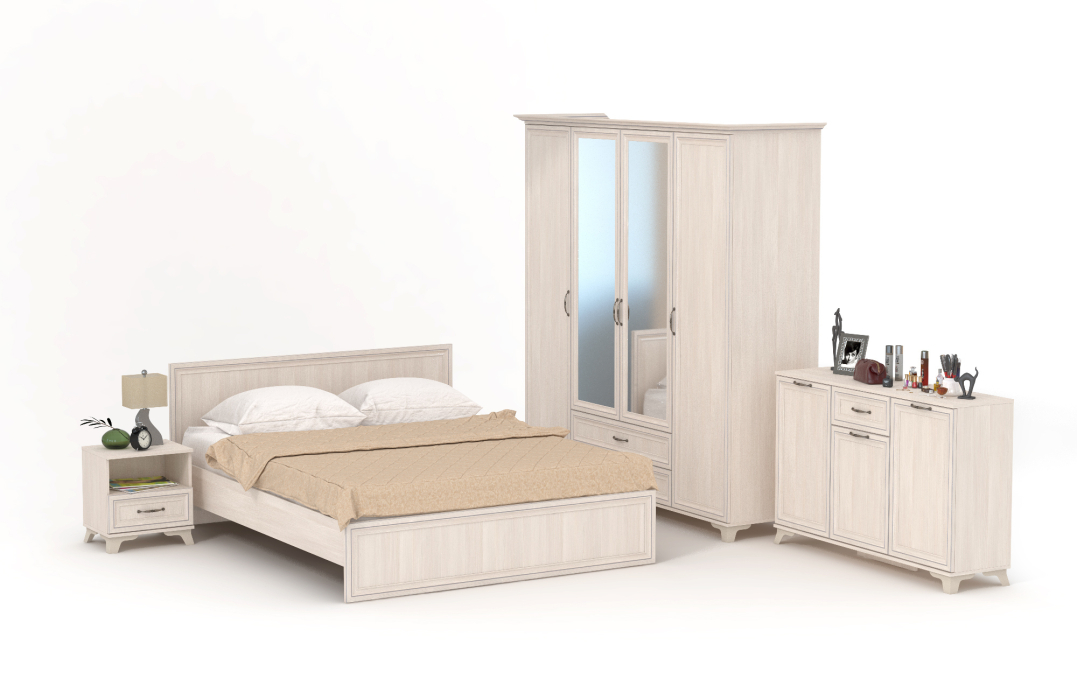 Комод Ариэль КМ-1 (Размеры:1351x358, h868 мм), Тумба прикроватная Ариэль (Размеры:452x358, h484 мм) 2шт., Кровать 1600 Ариэль КР-2 (Размеры:1656x2048, h857 мм), Шкаф четырехдверный Ариэль ШК-4 (Размеры: 2077х600, h2097 мм).