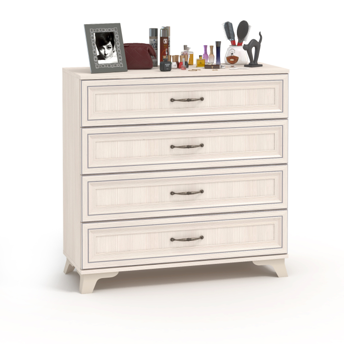Комод является неотъемлемой частью каждой спальни. В нем хранятся пастельное белье, личные вещи. На его столешницу можно поставить предметы декора, часы, зеркало или телевизор. Комод Ариэль КМ-4 - это большой красивый, современный комод с четырьмя вместительными выдвижными ящиками. Изделие изготовлено из высококачественного и экологически чистого ЛДСП + МДФ.