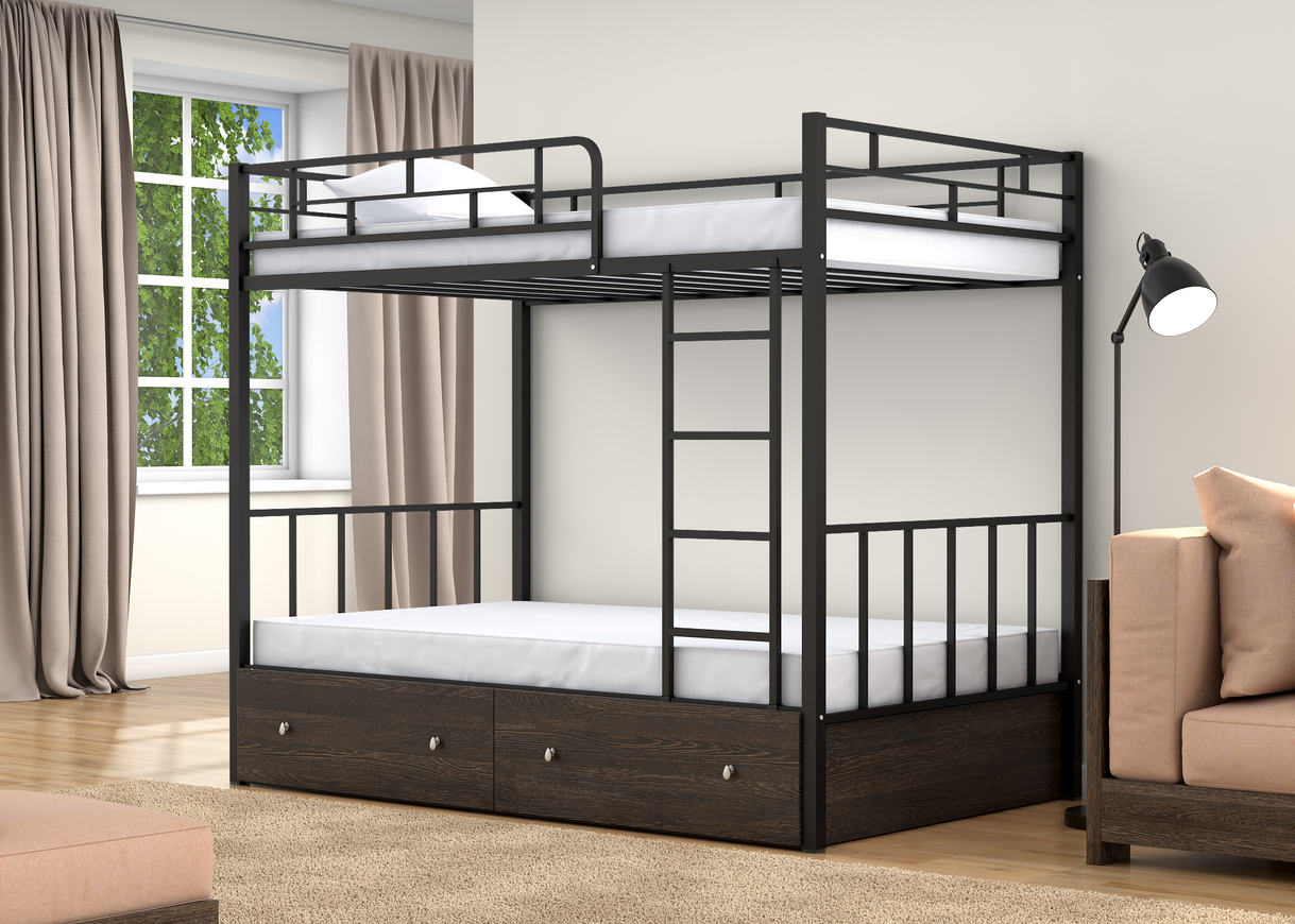 Спальные места 120х190 см., прочный стальной каркас, покрашен безопасной не имеющей запаха порошковой краской. Цвета на выбор: коричневый, черный, слоновая кость. Дополнительно комплектуется выдвижными ящиками и навесной полкой, материал ЛДСП 16 мм., цвета на выбор: дуб молочный или венге.