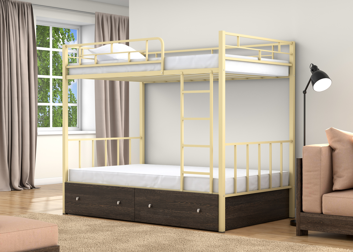 Спальные места 120х190 см., прочный стальной каркас, покрашен безопасной не имеющей запаха порошковой краской. Цвета на выбор: коричневый, черный, слоновая кость. Дополнительно комплектуется выдвижными ящиками и навесной полкой, материал ЛДСП 16 мм., цвета на выбор: дуб молочный или венге.