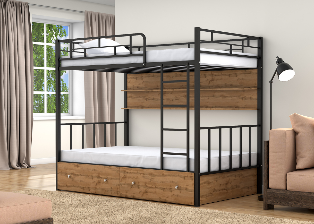 Спальные места 120х190 см., прочный стальной каркас, покрашен безопасной не имеющей запаха порошковой краской. Дополнительно комплектуется выдвижными ящиками и навесной полкой, материал ЛДСП 16 мм.