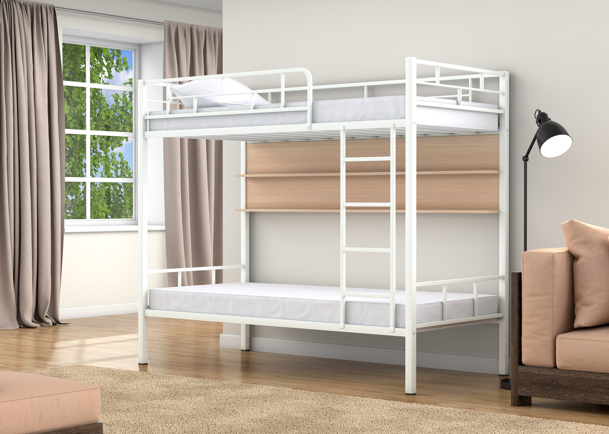 Спальные места 90х190 см., прочный стальной каркас, покрашен безопасной не имеющей запаха порошковой краской. Цвета на выбор: коричневый, черный, слоновая кость. Дополнительно комплектуется выдвижными ящиками и навесной полкой, материал ЛДСП 16 мм., цвета на выбор: дуб молочный или венге.